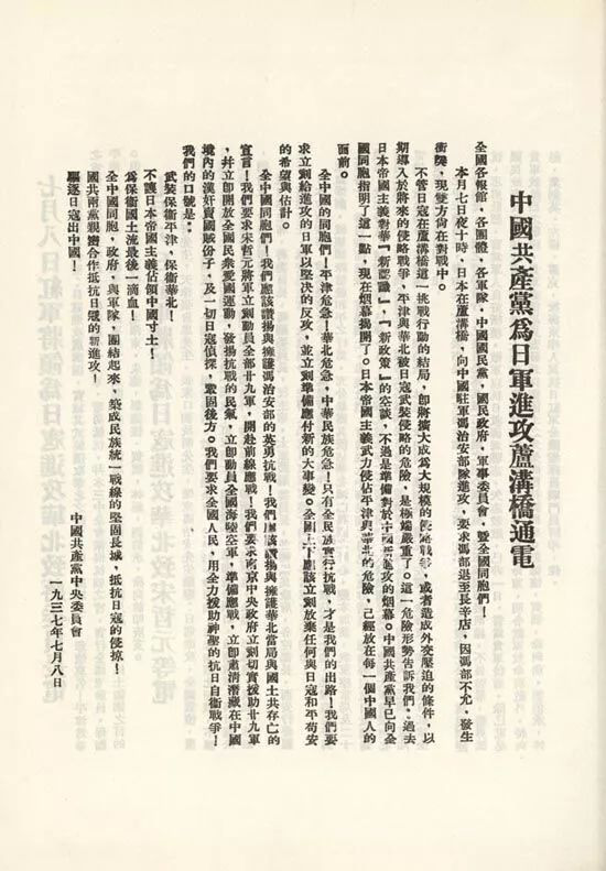 1937年7月8日,中共中央为日军进攻卢沟桥通电。呼吁:全中国同胞、政府与军队,团结起来,建筑民族统一战线的坚固长城,抵抗日寇的侵略!国共两党亲密合作抵抗日寇的新进攻!驱逐日寇出中国!