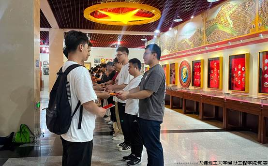 在党委办公室高箐萌老师的带领下,全体学生党员在历史珍藏馆内面向党旗重温入党誓词。随后,党支部书记为新发展党员佩戴党员徽章,并赠送《中国共产党章程》。