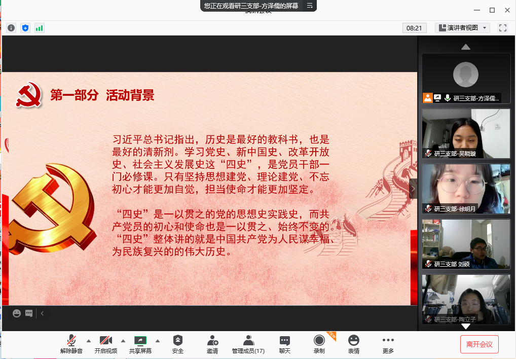建筑学硕士生三支部于2020年11月30日19:00在线上腾讯会议组织了大型历史事件纪录片《为了和平》的放映,全体党员、支部委员都在线上参与了此次观看纪录片活动。