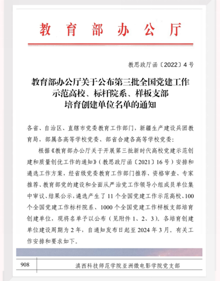 (文/魏正子 图/张浩然等)根据《教育部办公厅关于公布第三批全国党建示范高校、标杆院系、样板支部培育创建单位名单的通知》(教思政厅函[2022]4号),滇西科技师范学院亚洲微电影学院党支部入选第三批“全国党建工作样板支部”培育创建单位,为迎接党的二十大胜利召开交出了一份优异的答卷。