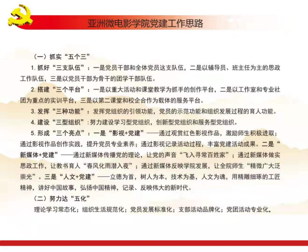 亚洲微电影学院党支部成立于2016年,一直以来,以调动党员积极性、主动性、创造性为着力点,强化顶层设计,突出改革创新,全面推进政治建设、思想建设、组织建设、作风建设、纪律建设和制度建设,不断探索“抓实五个三、努力强五化”的党建工作思路,营造党建文化氛围,创新开展党史学习教育,积极培育“汀鹭”品牌,镜头对准伟大时代,开展多元课程思政,不断强化党支部的“七个有力”,积极探索,努力提升科学化建设水平,促进学院党建与学科专业同发展共进步。