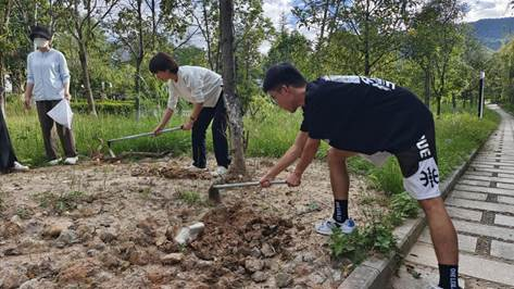 随后,在学院副院长夏丽娜和党支部书记李云勇的带领下,大家拿起劳动工具走进校园绿化带,以饱满的热情投入到本次活动中。他们充分发挥团结协作精神,衔接有序、配合默契,有的用工具除草,有的负责挖土,还有的负责播撒花种,一同为校园播下“向阳而生”的种子!为美化校园活动贡献了自己的力量。
