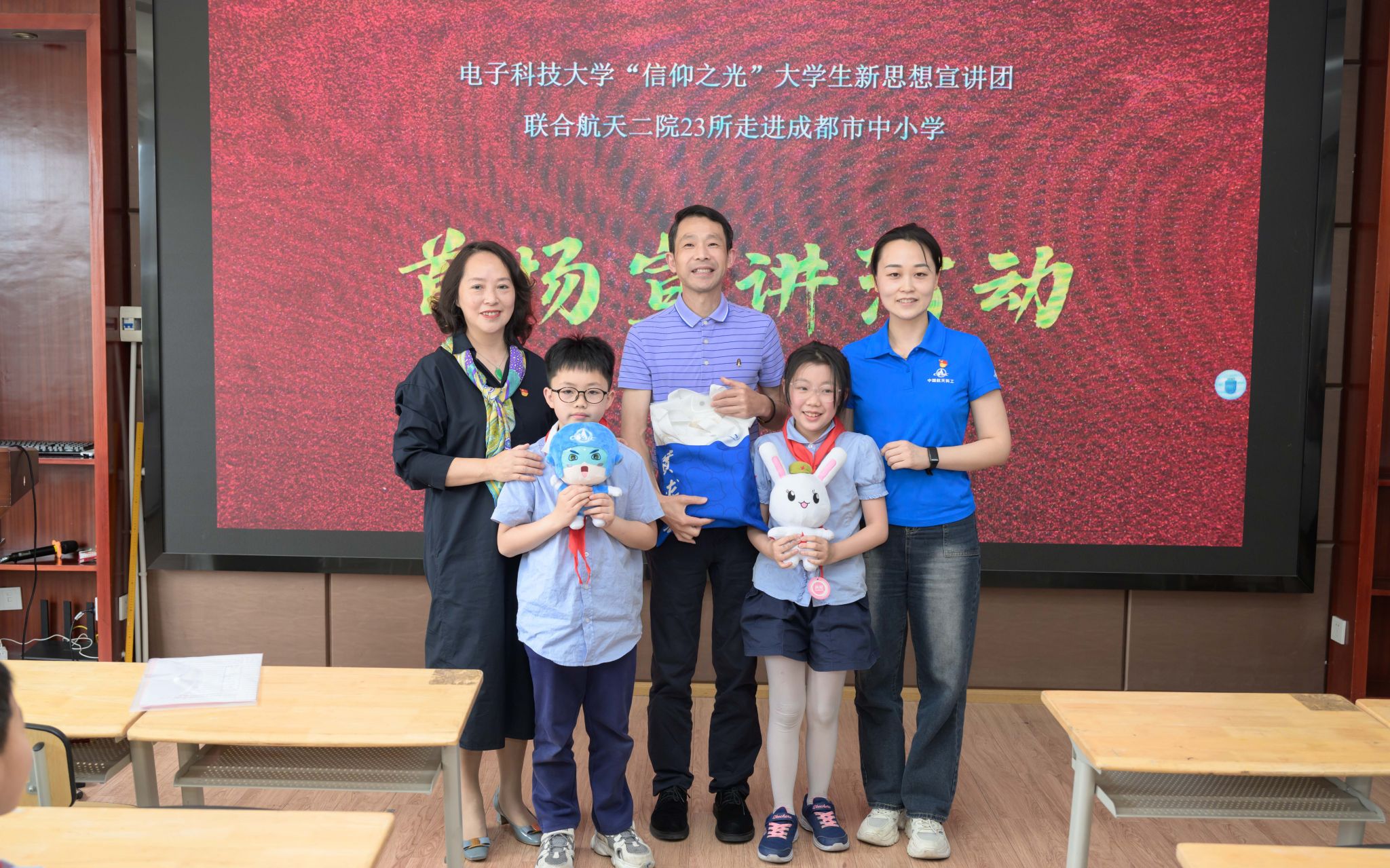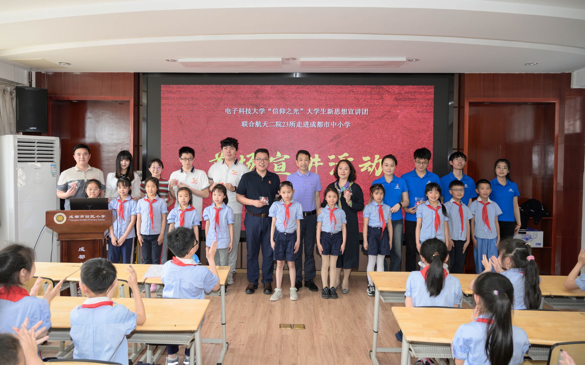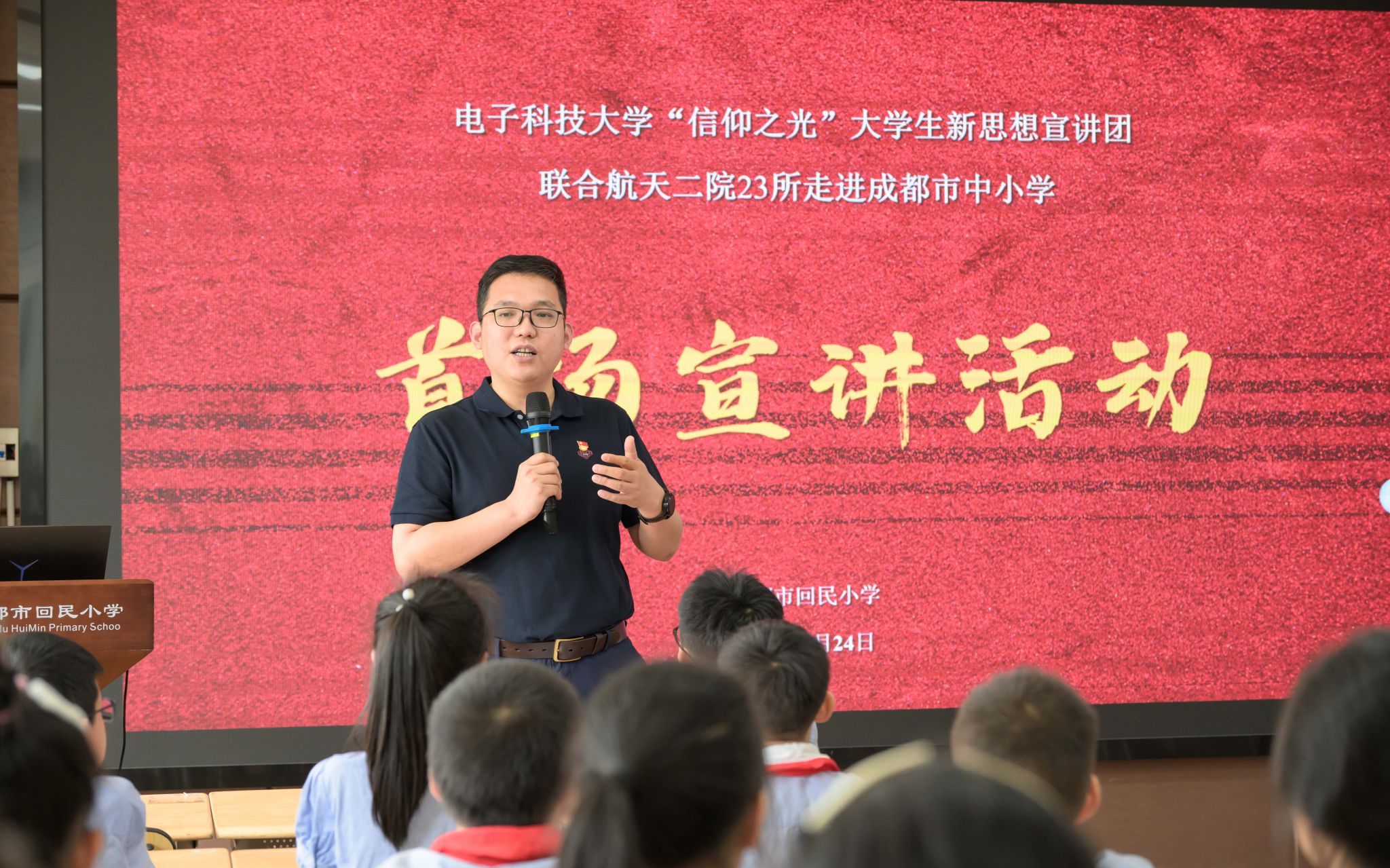 4月24日,在第九个“中国航天日”到来之际,信通党委“信仰之光”大学生新思想宣讲团联合中国航天科工二院二十三所航天精神科普宣讲团,前往百年名校成都市回民小学,开启走进成都市中小学的首场理论宣讲活动。成都市回民小学党支部书记、校长陈绍光,电子科技大学党委学生工作部副部长张琼,信息与通信工程学院党委副书记耿宝莹,中国航天科工二院二十三所成都研发中心党支部组织委员马博士等领导嘉宾出席活动。