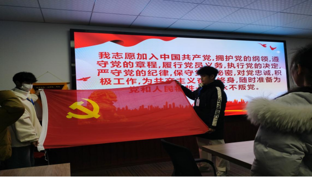 大会第三项,由何青老师带领全体党员进行入党宣誓。