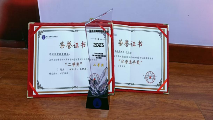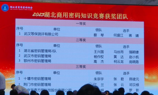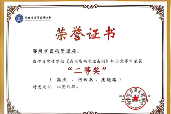 (供稿人:何青、庞晓路)12月26日,鄂州市密码管理局局长高杰带领由保密技术服务中心同志及鄂州职业大学教育管理学院22级小学教育5班庞晓路同学组建的鄂州代表队参加2023湖北商用密码知识竞赛。在全省激烈对抗的大舞台中,鄂州代表队奋发图强、锐意进取,并在全省各地市州、省直机关、本科院校及省商密协会成员企业的共计30支队伍中,鄂州市局代表队杀出重围,取得团体并列第二的成绩,荣获赛事“二等奖”。