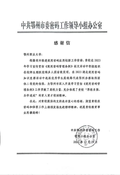 本次活动结束后,中共鄂州市委密码工作领导小组办公室给鄂州职业大学发来感谢信,对庞晓路同学在2023湖北商用密码知识竞赛中的良好表现给予高度肯定。信中写到,我校为鄂州市深入开展学习贯彻《商用密码管理条例》工作贡献了高校力量,充分体现了我校“厚德自胜,乐学道成”的育人育才的校训精神。