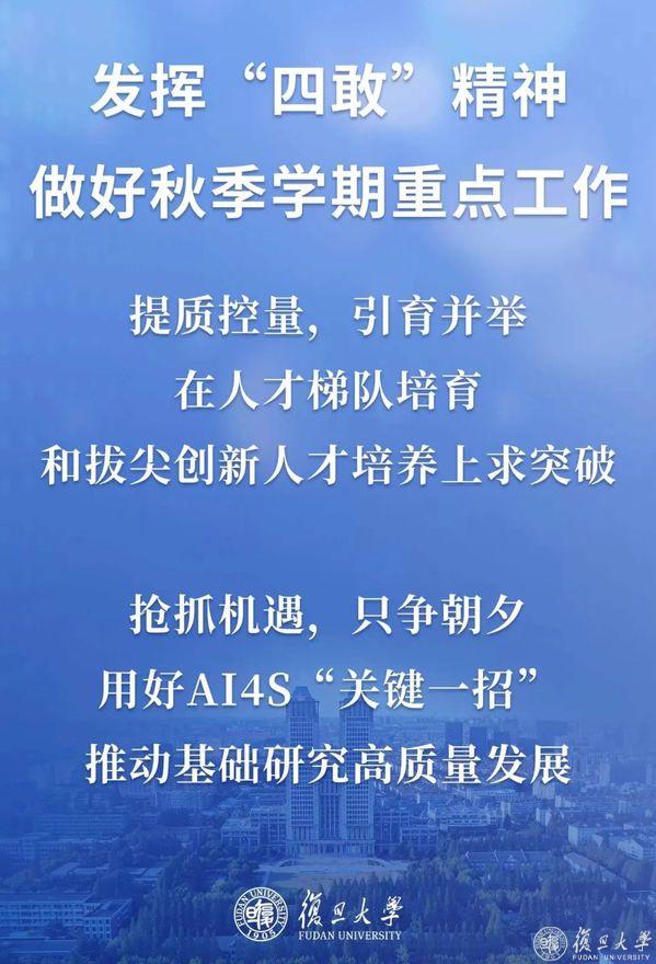 裘新指出,秋季新学期要发扬“四敢”精神,重点做好四方面工作:人才引育爬“北坡”,既在“聚天下英才而用之”方面上能级,也在人才梯队培育和拔尖创新人才培养上求突破。要进一步激发二级单位人才引育的主体作用,落实好“提质控量、引育并举”的人才队伍建设思路,积极推进人才培养范式改革、不断优化人才培养结构。基础研究当“发动机”,要把发展AI for Science (下文简称AI4S)作为提升原始创新能力、实现基础研究高质量发展的发动机,化科研挑战“最大变量”为基础研究“最大增量”。举全校之力抢抓机遇、用好AI4S“关键一招”,坚持“闷头做”“带头跑”,实现科研思想和科研范式变革,主动肩负AI4S改革重任。坚持系统集成、统筹兼顾的方法论,整合拓展学校办学资源,提升创新服务能力能级;增强“互属”意识,推动附属医院高质量发展,办好用好基础教育高质量品牌;凝炼校地合作的机制路径,实现服务学校事业发展与服务地方经济社会发展的双向奔赴、深度融合。发挥学校党建思政“承重墙”功能,承高质量发展之重,承掌握意识形态工作主动权之重,承铸魂育人之重,深入推动基层党建与事业发展深度融合,全面落实“时代新人铸魂工程”,加快构建具有复旦特色的思政工作体系,积极探索新时代育人新思路、思政新品牌、工作新抓手。