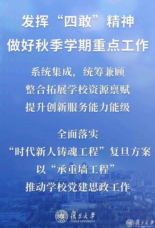“时代之问,复旦答卷”是2023学校全年工作的关键词。上半年工作的侧重点在于“问”和“思”,在主题教育中审题破题,找到解决问题的思路方法;下半年新学期工作侧重点在“答”和“行”,运用好主题教育成果和暑期校领导班子务虚会共识解题答题,全校充分发挥创造力、引领力、执行力,共同创造建设“第一个复旦”生动局面,迎接学校第十六次党代会胜利召开。