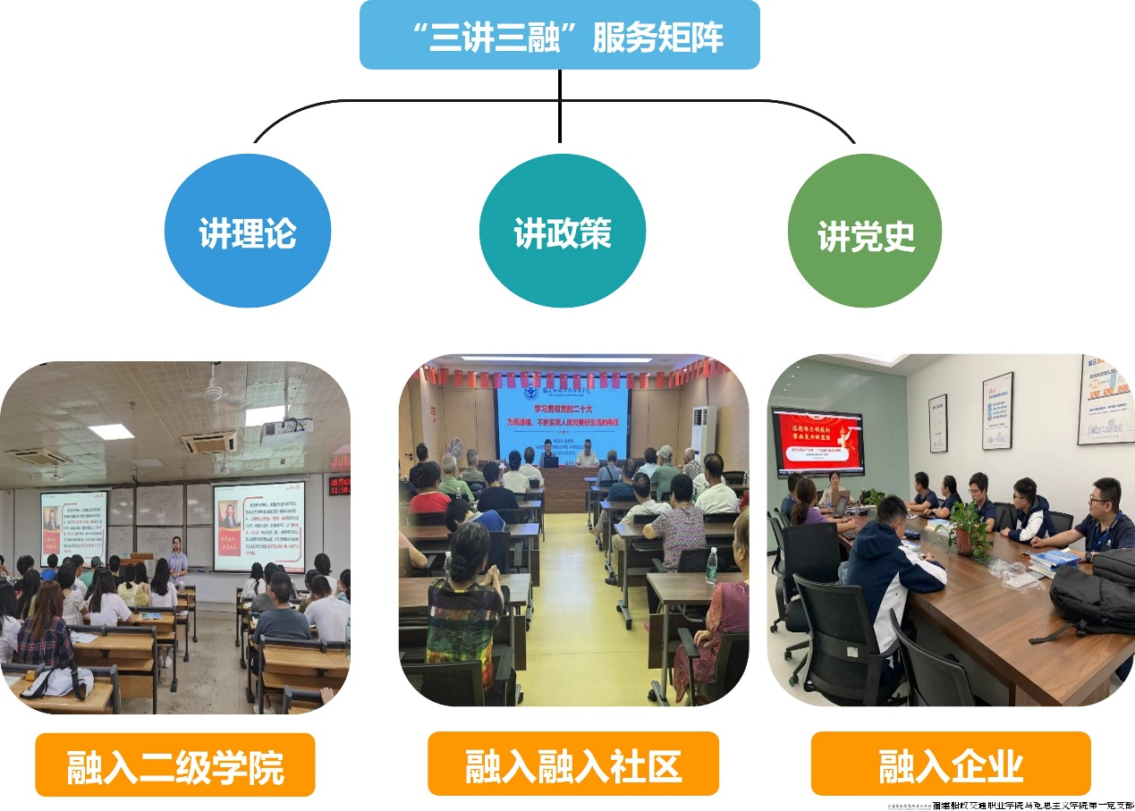 支部积极构筑服务平台,把坚定的信仰化为饱满的精神和工作劲头打通理论武装“最后一公里”,深入开展“三讲三融”活动,以“讲理论、讲政策、讲党史”为主要内容,融入二级学院、融入社区、融入企业”。近年来,支部组建师生社会实践小分队,先后到南靖县团委、南靖县金山镇、莆田仙游团县委进行理论下乡服务,助力乡村振兴;支部组建宣讲团奔赴各二级学院累计开展了46场报告会,在全院掀起了学习党的最新理论的热潮;同时奔赴下藤社区、港垱社区、鑫龙社区、建新镇等开展宣讲21场,助推基层党建的理论宣传工作。在“三讲三融”中攻克难点瓶颈,宣传阐释理论、解读方针政策,实现支部党建与服务社会有机统一。