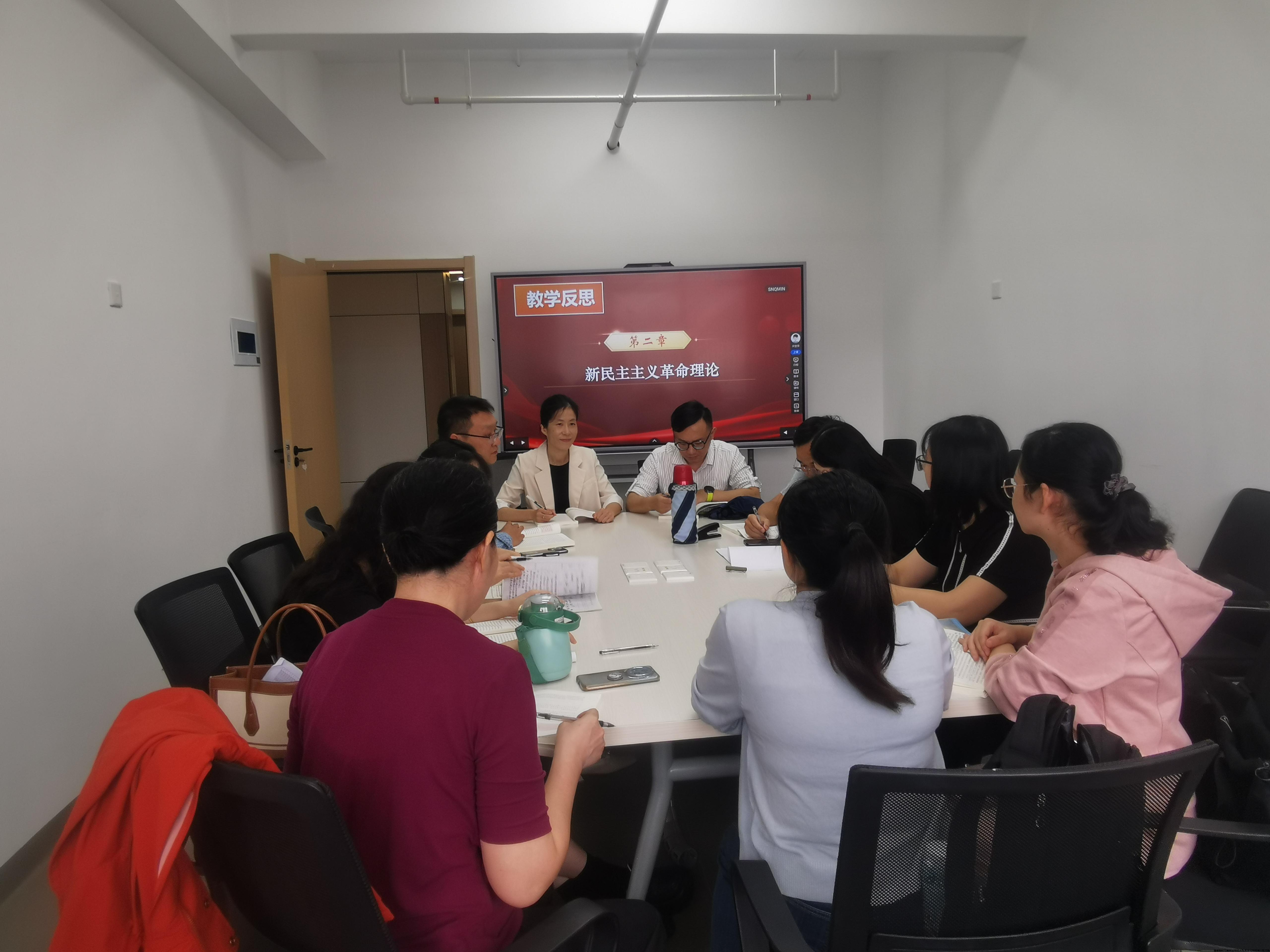 首先,老师们围绕第二章教学内容《新民主主义革命理论》进行教学反思。大家一致认为,要将理论讲解和案例分析相结合,注重讲清楚近代中国国情、近代中国革命的时代特征以及新民主主义革命的实践探索,使学生深入了解新民主主义革命的总路线、基本纲领、革命道路和基本经验,引导学生赓续红色血脉,为中华民族的伟大复兴而努力奋斗。