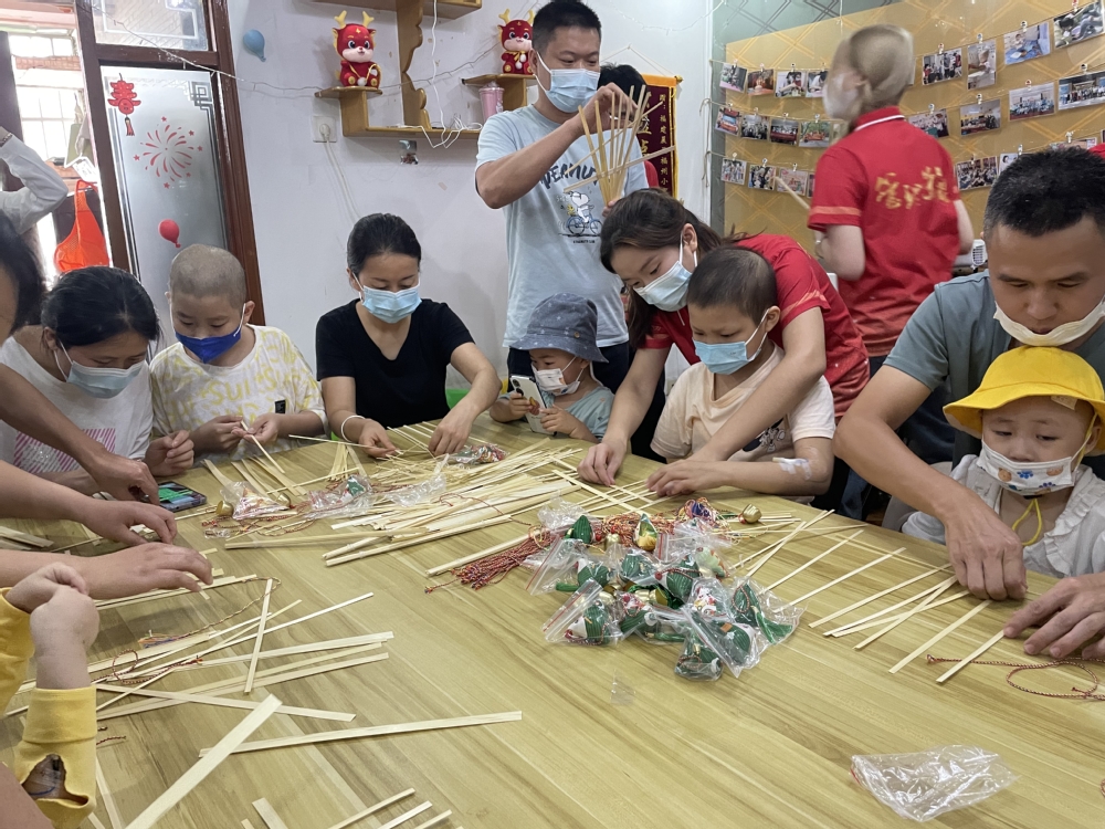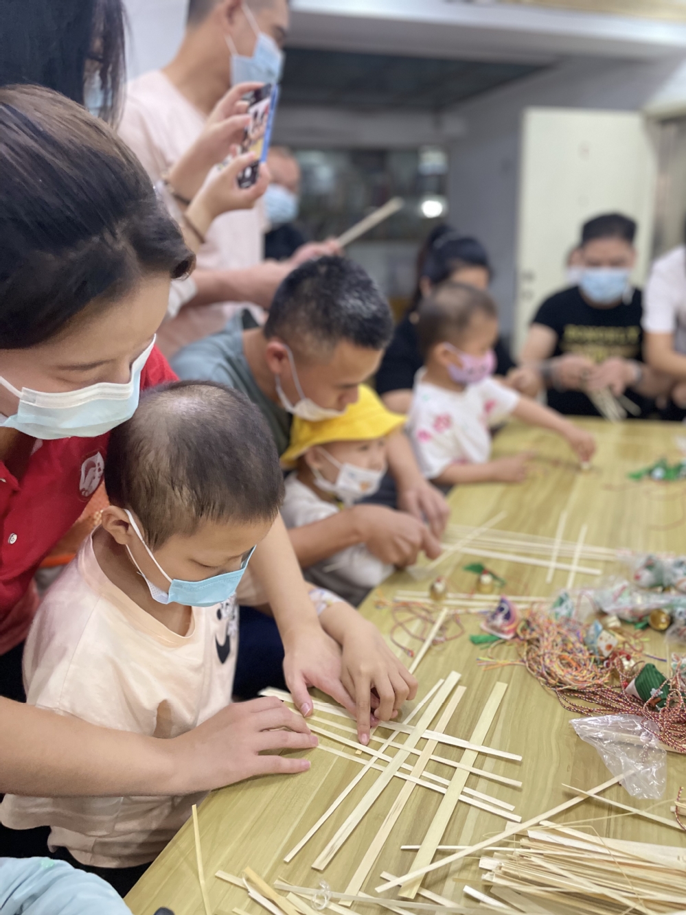 在随后的DIY竹编龙舟活动中,家长与小朋友们齐动手,志愿者们耐心引导,共同编织竹条,挂上铃铛。一艘艘精致的小龙舟逐渐成形,还在竹船上放置了艾草的卡通粽子香囊,小朋友们拿着亲手编织的小船,脸上露出了开心、满足的笑容。