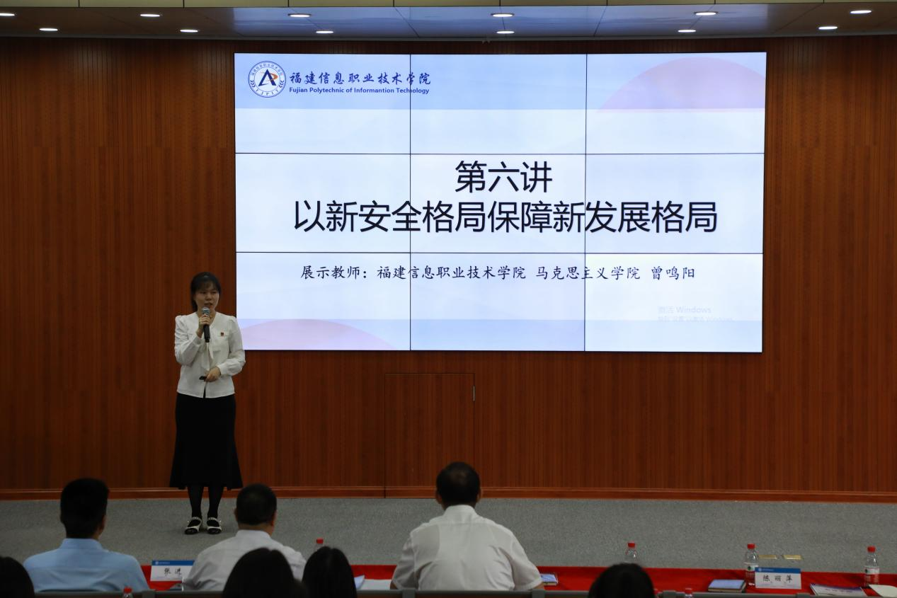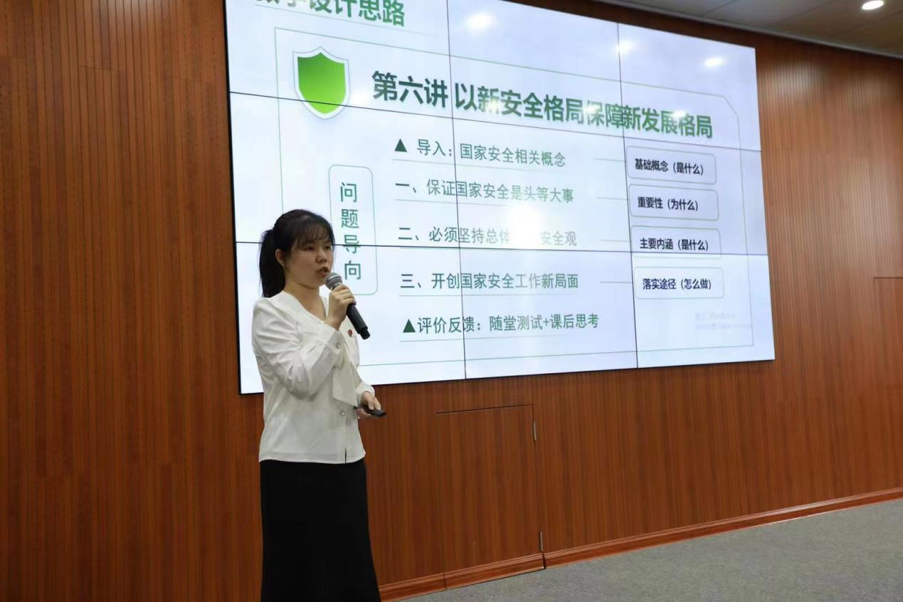 在教学展示环节,曾鸣阳老师以“第六讲:以新安全格局保障新发展格局”为题,首先进行整体教学思路分析,其次展开片段教学展示,运用多种教学方法,结合学生专业所学,引导学生“学、思、践、悟”,达成教学目标。厦门市委党校牛君教授在点评中肯定其教学设计符合高职院校学生特点,师生能够形成有效互动,具有针对性,但可以增强更多学理性。