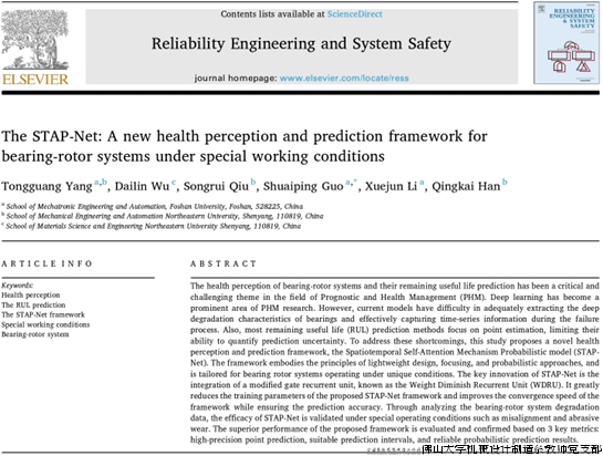 近日,机械工业转子振动监测及诊断技术重点实验室李学军教授团队,以佛山大学为第一署名单位在机械可靠性工程领域国际顶级期刊《Reliability Engineering and System Safety》上发表题为“The STAP-Net: A new health perception and prediction framework for bearing-rotor systems under special working conditions”的研究性论文,郭帅平教授为通讯作者,李学军教授为共同作者,机械工业转子振动监测及诊断技术重点实验室与东北大学联合培养的博士生杨同光为第一作者。该论文提出了一种轴承-转子系统健康感知和寿命预测的新框架,该框架在保证预测精度的同时,极大地减少了模型的训练参数。该框架对轴承-转子系统的健康状态预测提供了有效的解决方案。