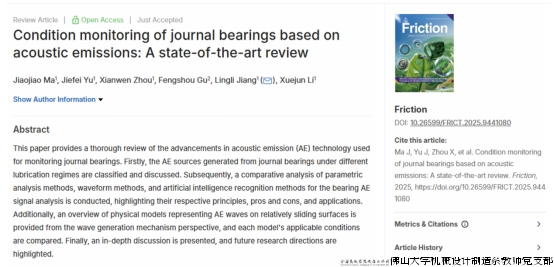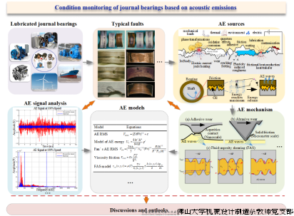 近日,机械工业转子振动监测及诊断技术重点实验室李学军教授团队与英国哈德斯菲尔德大学合作,以佛山大学为第一署名单位在摩擦学领域国际知名期刊《Friction》上发表题为“Condition monitoring of journal bearings based on acoustic emissions: A state-of-the-art review”的综述性文章,马姣姣副教授为第一作者,蒋玲莉教授为唯一通讯作者。该论文将声发射技术在监测滑动轴承中的应用进行了全面的综述,包括总结不同润滑状态下滑动轴承产生的声发射源,分析滑动轴承声发射信号常用方法的优缺点,概述了适用于相对滑动表面的声发射物理模型,并指出未来的研究方向。