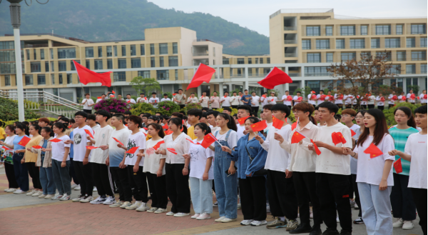 一段合唱后,人群快速聚拢在广场中央,嘹亮的《没有共产党就没有新中国》千人合唱响彻校园,学生工作处团委支部党员、各民族学生代表、留学生代表、特教学生代表挥舞着手中的红旗,用歌声表达对党的深情祝福。