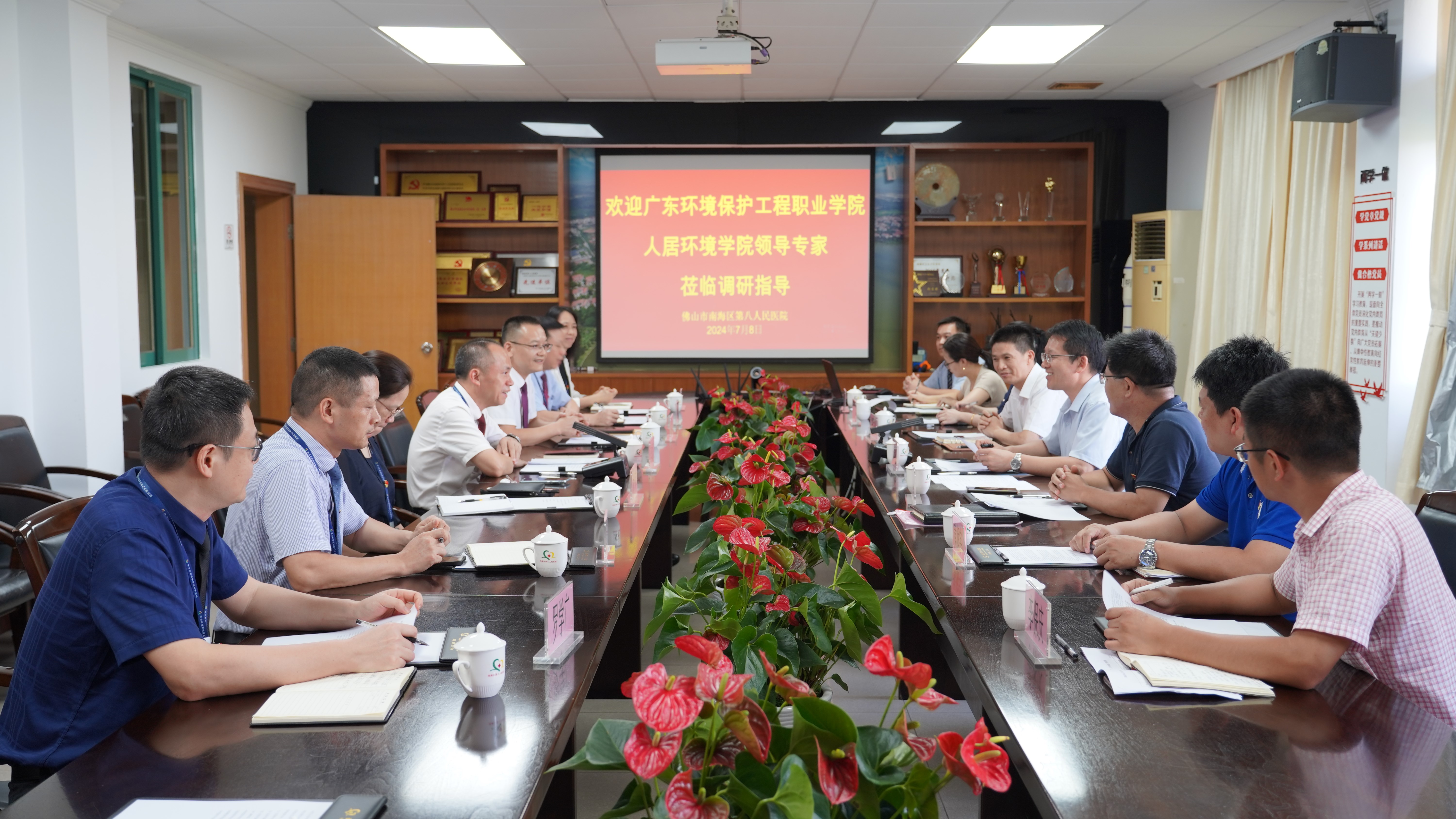 为深入贯彻党的二十大精神,构建“共建共创、优势互补、资源共享、互促共赢”的党建新格局,7月8日下午,人居环境学院赴南海区第八人民医院(下面简称南海八院)开展艾草产业调研与党建结对共建交流活动。学校党委委员、副校长宋学忍,人居环境学院党总支书记罗国良、院长祝军权、教师党支部书记喻晓洁等学院领导班子代表,南海八院党委书记、院长李如职,党委副书记、副院长冯健宜等医院党政领导班子、职能部门代表一同参加了此次交流活动。