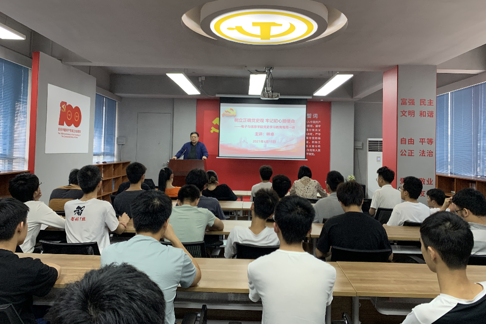 4月15日,电子与信息学院在东校区初心斋举行了“学党史•励初心•谋发展”党史学习教育系列活动第七讲,邀请校关工委常务副主任、原副校长林卓同志讲授专题党课,学院学生党员和入党积极分子代表共70余人参加此次党课,此次党课由电子与信息学院党委副书记梁茵主持。