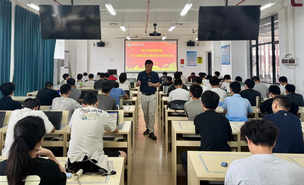 为进一步做好师范生教育实习工作,引导学生更好地了解实习安排,明确实习目标。6月27日,电子与信息学院举行2026届师范生教育实习动员大会,学院副院长林沛、教育实习相关指导老师以及2026届师范专业全体同学参加了动员会。