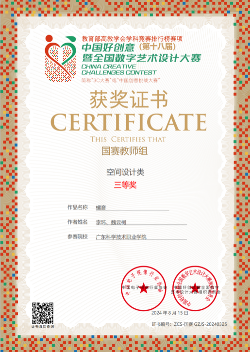我院参赛获奖作品《国家自然博物馆标志设计》选取国家自然博物馆藏品中具有代表性的植物、动物等进行设计,传播效力强,展现了中国特色和文化自信,传达人与自然和谐共生的理念;《智谱脉络》作品聚焦人工智能这一新质生产力引擎,将人工智能发展历程、应用领域及社会影响等进行艺术创意可视化呈现;《螺音》为城市边缘性乡村焕发生机,重寻旧彩,是对扎根土地本土文化的溯源,以及新旧建筑的融合创新。计算机学院坚持教学相长,分类组建教师团队参加各类专业竞赛,不断提升教师数字素养和教学水平。