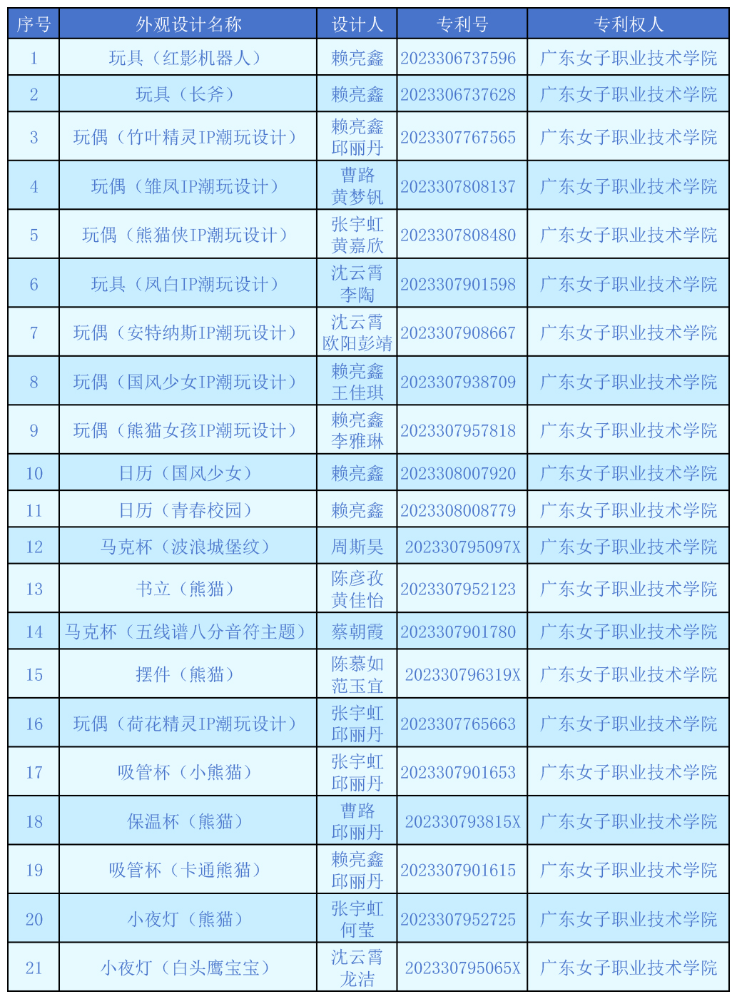 近日,从国家知识产权局官网查询获悉,我校动漫制作技术专业群师生团队成功获得21项国家知识产权局外观设计专利授权(数据统计时间:2023年12月至今),这些外观设计专利涵盖了电子产品、家居用品和潮玩设计等,具有较高的实用性和创新性。这一成果标志着我校在知识产权保护和创新能力方面得到进一步提升。