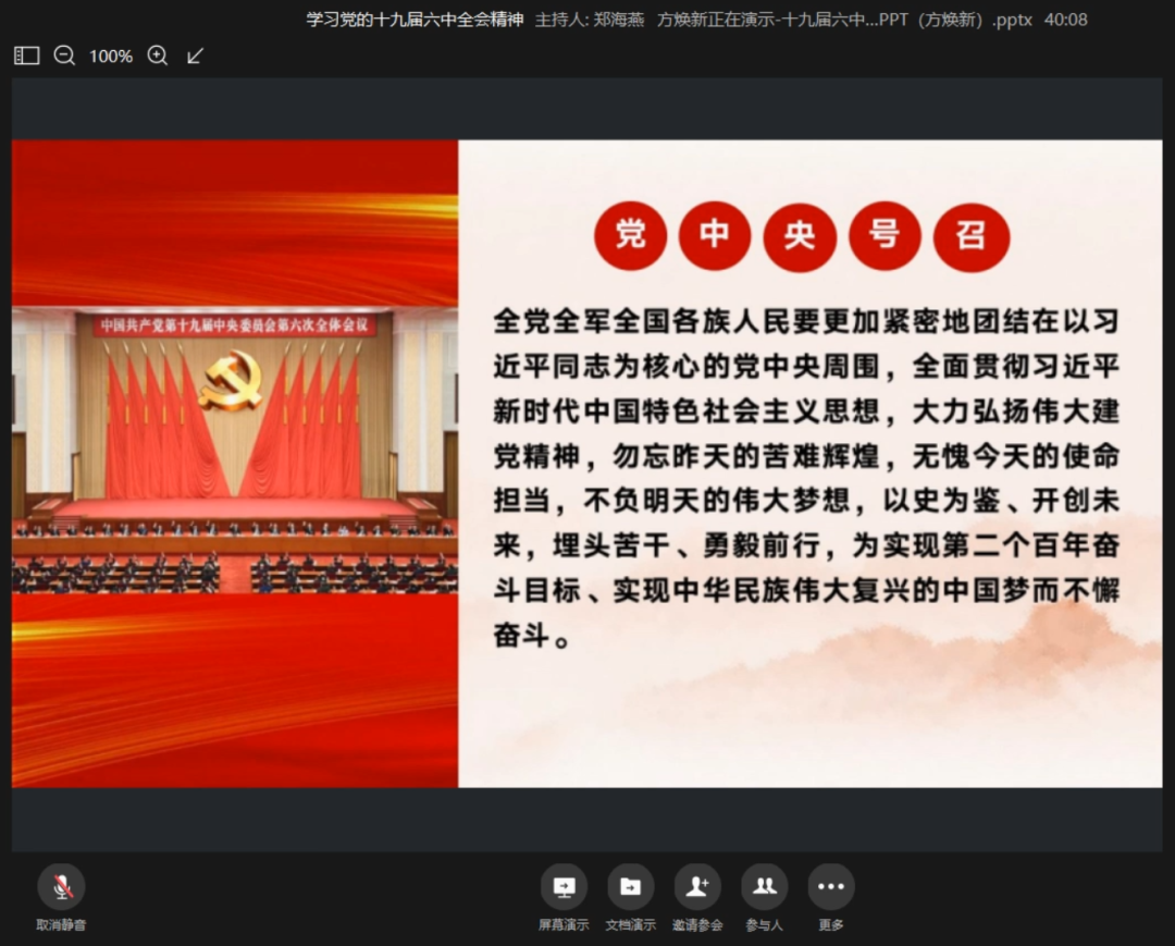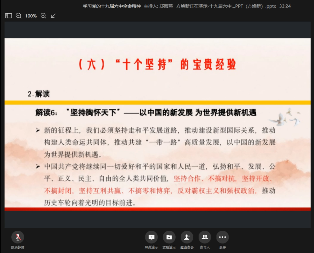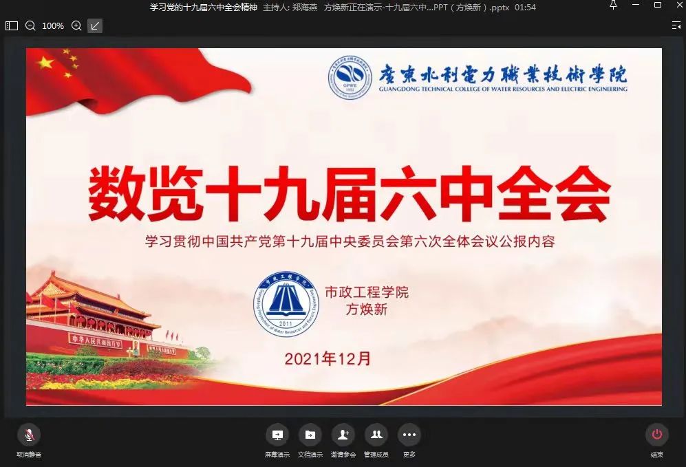 百年奋斗铸就世纪伟业,伟大梦想造就前行道路。为深刻学习贯彻十九届六中全会精神,深刻认识党的百年奋斗重大成就和历史经验。2021年12月16日下午14:30,市政工程学院党总支在企业微信召开了数览十九届六中全会精神学习会议,市政工程学院党总支党员出席本次会议,本次会议由市政工程学院党总支副书记方焕新主持。