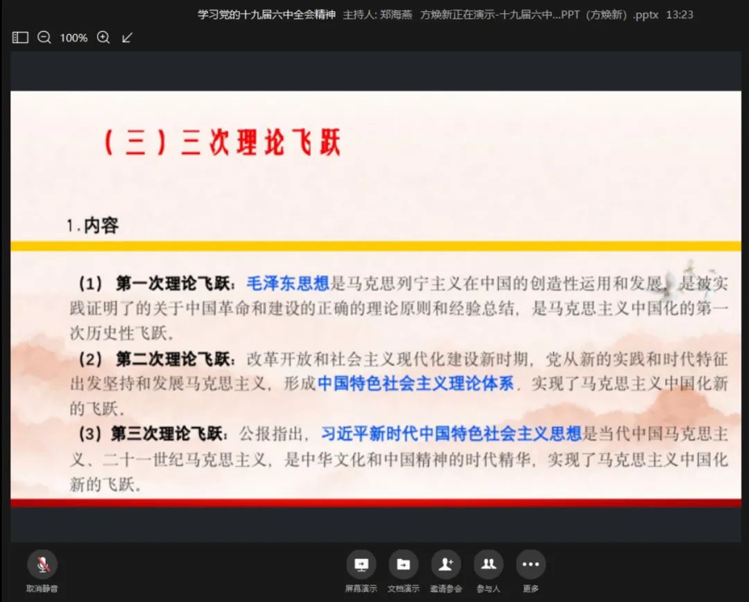 会议伊始,方焕新书记以《中共中央关于党的百年奋斗重大成就和历史经验的决议》为主要内容,从“一个根本问题”、“两个确立”、“三次理论飞跃”、“四大历史时期、四大历史任务、四大伟大成就”、“五大历史意义”、“‘十个坚持’的宝贵经验”、“党的十八大以来13方面的重要成就”、“全党四个必须”、“二十大继往开来”等方面展开讲解。
