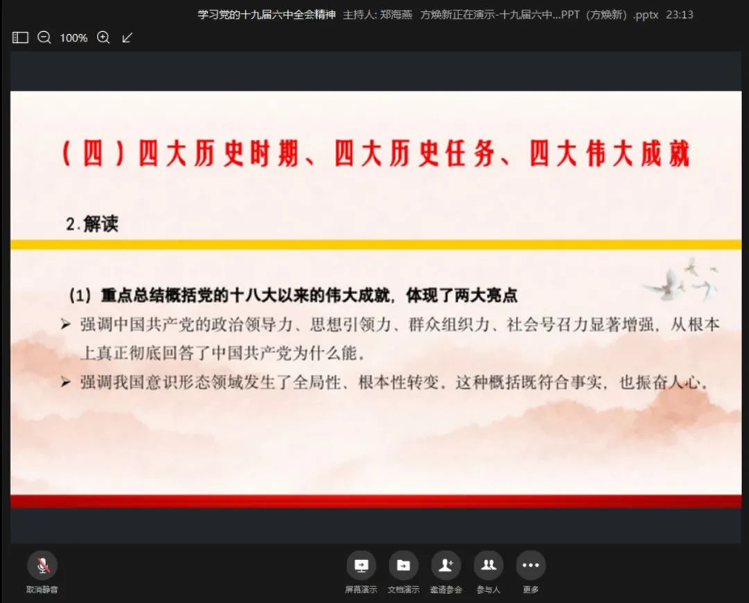 随后,方书记对《中共中央关于党的百年奋斗重大成就和历史经验的决议》进行详细解读,他强调,《决议》中总结了中国共产党百年艰辛奋斗历程,展现了百年辉煌的历史成就,全面汇总了坚持和发展中国特色社会主义的伟大成就和基本经验,使教工们对党的百年艰辛发展史和党的奋斗目标有了更深入的了解。