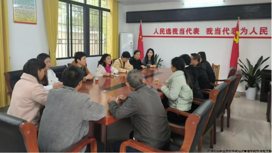 陈斌珠介绍了教师党支部顺利通过教育部第三批“全国党建工作样板支部”建设单位验收的好消息。她表示,近一年来,教师党支部围绕基层党建、乡村振兴和红色文化等方面开展教科研研究,取得了一些成绩:经济管理学院助力乡村振兴的典型做法入选《全国乡村振兴优秀案例》,教师党支部党员获批立项省级乡村振兴相关课题6项、市级党建课题1项,指导学生参加第十四届全国大学生红色旅游创意策划大赛荣获红色旅游营销方案设计类华南赛区一等奖。今后,教师党支部将继续充分发挥全国党建工作样板支部的引领作用,加强基层党组织建设,推动党建与业务工作深度融合,与结对支部一起探索构建“优势互补、相互促进、共同提高”的党建工作新格局。