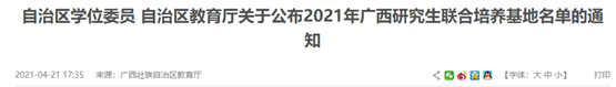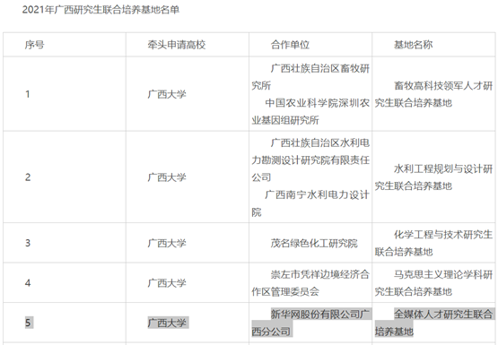 2021年4月21日,自治区学位委员会、自治区教育厅公布2021年广西研究生联合培养基地名单,以广西大学新闻与传播学院新闻传播学科为主体申报的“全媒体人才研究生联合培养基地”名列其中,广西大学共有10个基地获批。