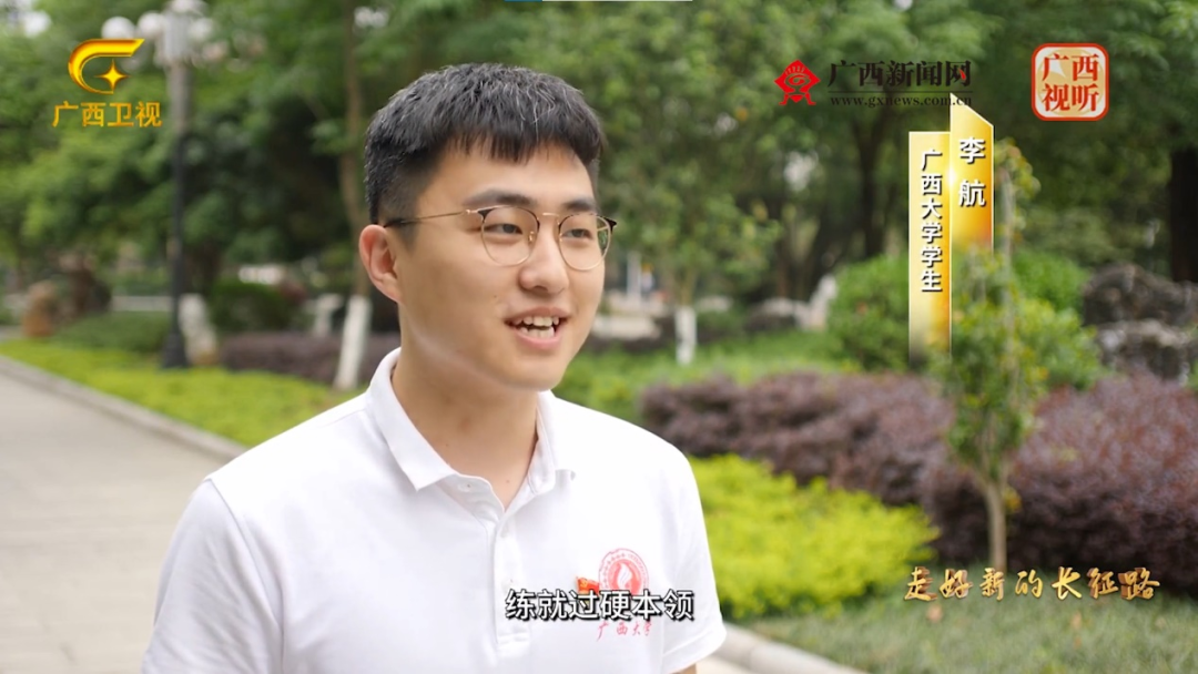 4月16日,广西大学新闻与传播学院2018级播音与主持艺术专业181班的李航同学参与录制的电视专题片《紧跟伟大复兴领航人踔厉笃行》第五集《走好新的长征路》,在广西广播电视台综合频道(广西卫视)播出。