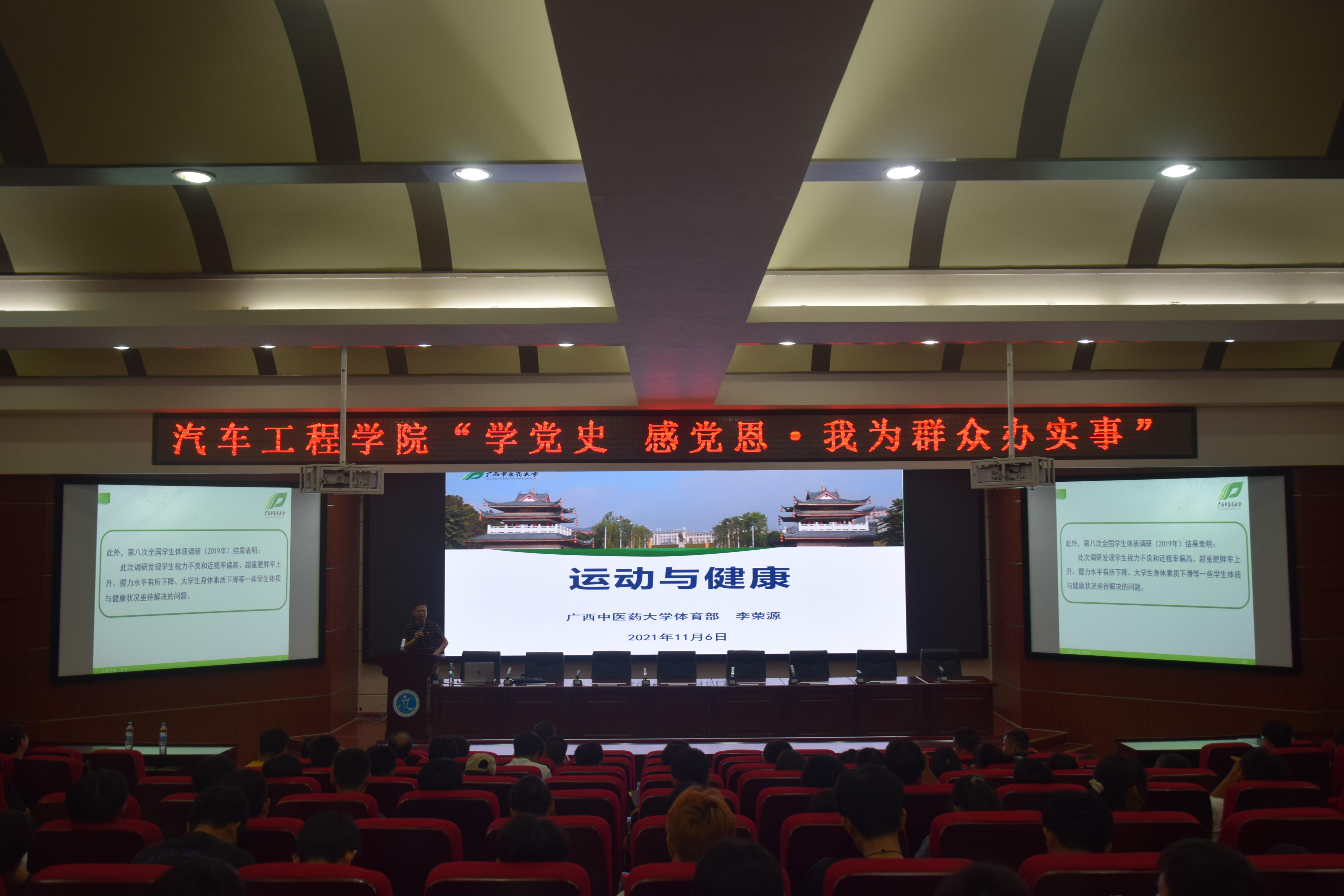 (汽车工程学院 讯 梁业灿、覃炳露/文)2021年11月06日下午,乘着汽车工程学院擎力体育文化节的秋风,学院党总支为群众办实事,特邀广西中医药大学体育运动健康专家李荣源教授,在昆仑校区C1多功能厅为全院师生开展了一场关于“运动与健康”主题讲座。学校体育部部长曾忠文、学院副书记吴丹参加了本次讲座。