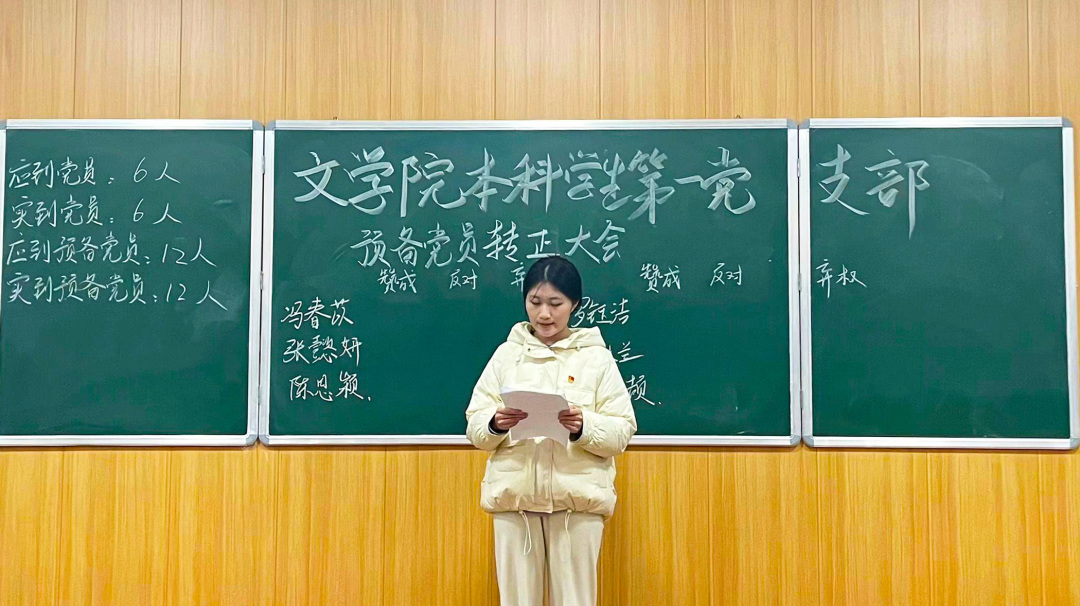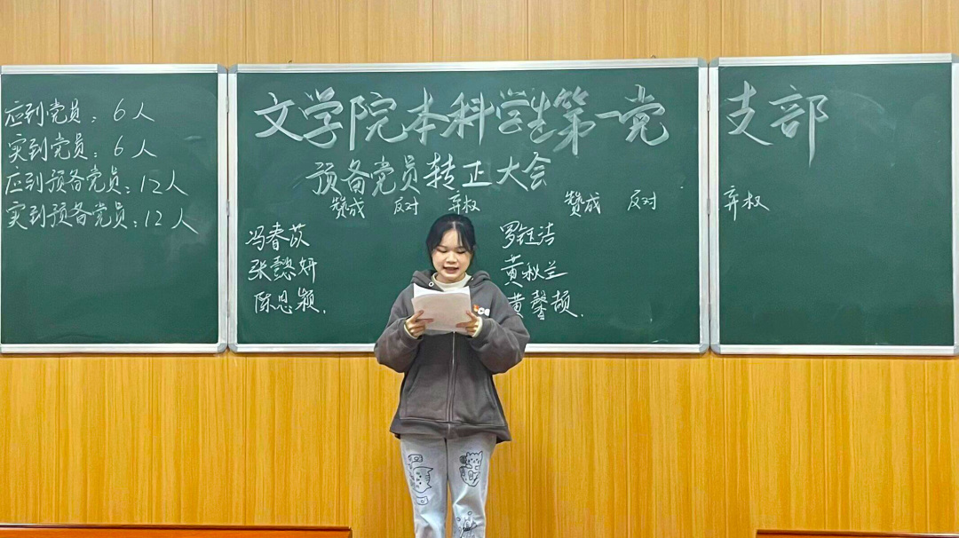覃志林简要介绍了预备党员转正的流程。本次申请转正的预备党员有冯春苡、张懿妍、陈思颖、罗钰洁、黄秋兰、黄馨颉,6名预备党员分别向党组织汇报了自己在预备期间思想、工作、学习、生活等各方面的表现。总结成绩和进步,找出缺点和不足,并郑重宣读了转正申请,表明自己的转正态度和为党的事业奋斗终身的决心。宣读结束后,入党介绍人分别介绍申请转正的同志在预备期一年的表现情况,表明能否按期转正意见。与会党员对6名预备党员能否按期转正进行了充分讨论,经无记名投票表决,6名预备党员均全票通过,按期转为中共正式党员。