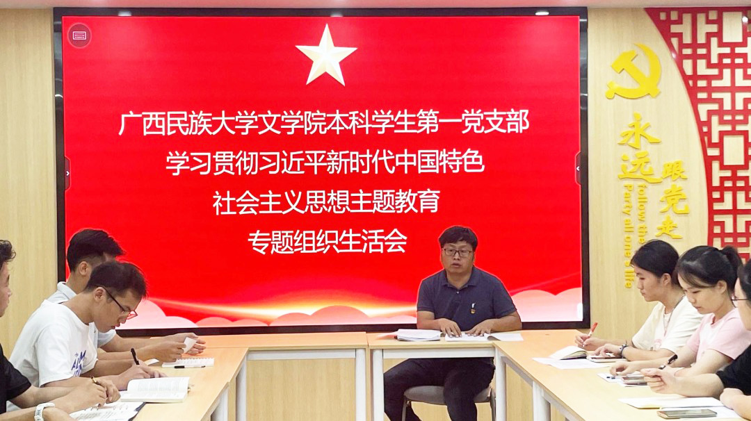 9月10日,文学院本科学生第一党支部在红楼107室召开学习贯彻习近平新时代中国特色社会主义思想专题组织生活会。会议由组织委员覃志林主持,支部书记陈爱中、支部全体党员参加会议。支部书记陈爱中强调,要着力解决高校基层党支部建设 “两张皮”问题,始终结合大学生身份开展党建工作,真正落实落细“党建+创意写作”的支部特色,把支部建设推向更高水平,真正做到“以学促干”。