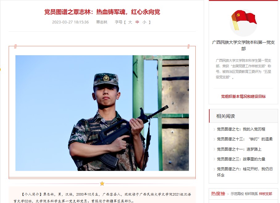 3月27日,在“全国高校思想政治工作网”推送党员图谱系列——党员图谱之覃志林:热血铸军魂,红心永向党。本科学生第一党支部将持续总结优秀党员的突出事迹和先进经验,通过党员图谱的形式推出,鼓励党员争做模范榜样,形成党员模范的凝聚力和示范效应。