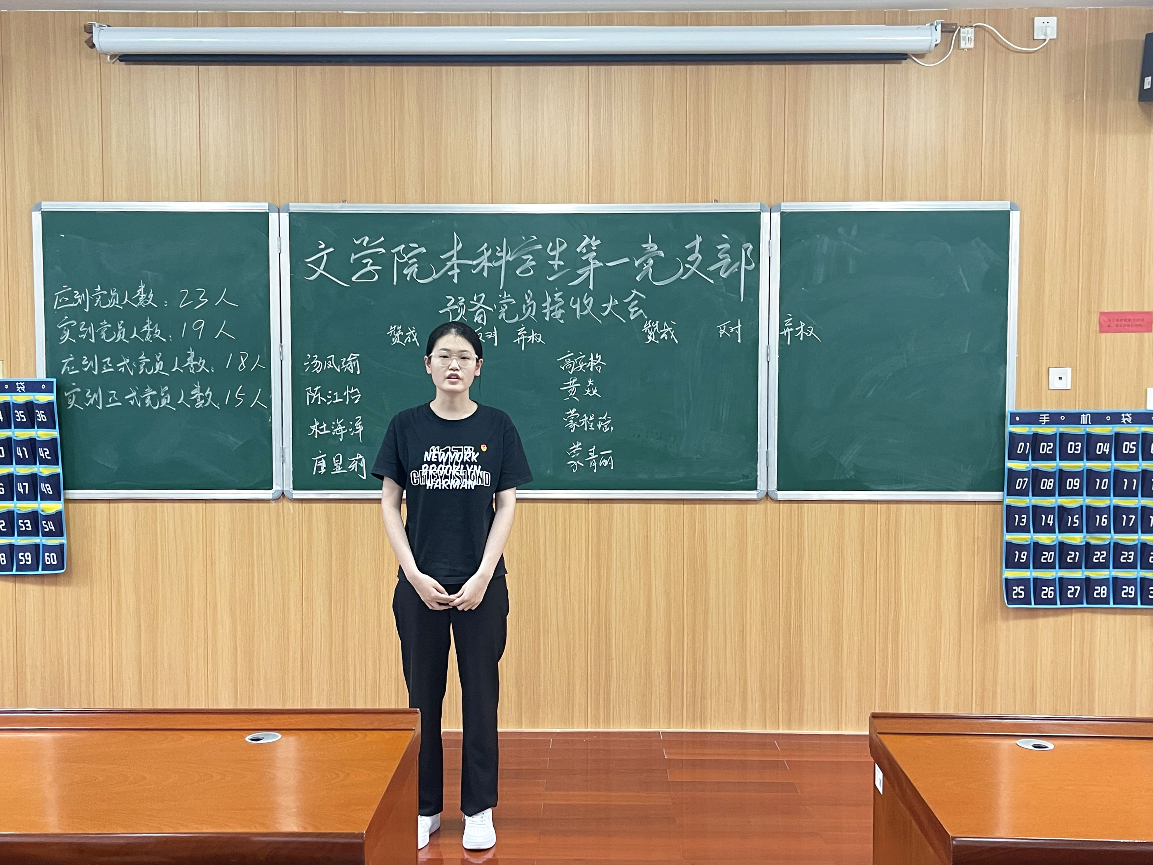 会议伊始,全体党员高唱国歌。组织委员覃志林对此次接收大会的参会情况进行说明,对发展对象的群众调查意见及政治审查情况进行宣读。八名发展对象依次上台汇报自己对党的认识、本人履历、现实表现、家庭和主要社会关系以及需要向党组织说明的有关问题。每名发展对象汇报完毕后,由入党介绍人介绍其基本情况,并对其能否入党表明意见。通过充分讨论与正式党员无记名投票表决,大会同意接收汤凤瑜、陈江怡、杜海洋、唐显莉、高安格、黄焱、蒙程瑶、蒙青丽八名同志为中共预备党员。