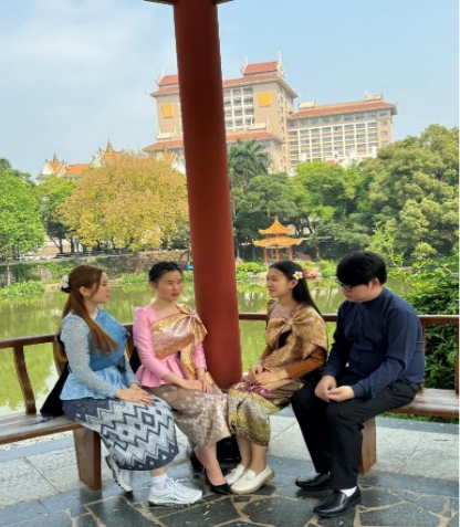 活动以“架起文明互鉴桥梁”为主题,学生团队集中在广西民族大学相思湖校区风雨桥、大礼堂、和园、相思湖红船走廊、泰国公主楼等地点取景拍摄中国学生与老挝留学生的演唱视频。在活动筹备及拍摄阶段,党支部的老师们与来自东南亚的留学生进行深入的沟通与交流,以确保指导过程更具针对性和实效性,并结合留学生的实际情况,制定详细的拍摄计划和指导方案。活动过程中,老师们根据情况有效调动中老双方学生的情绪状态,帮助提高学生的镜头表现力,加强学生的团队合作精神,不仅深化了中老学生之间的友谊,还提升了学生的跨文化交际能力,推动友好交流与文化互鉴。