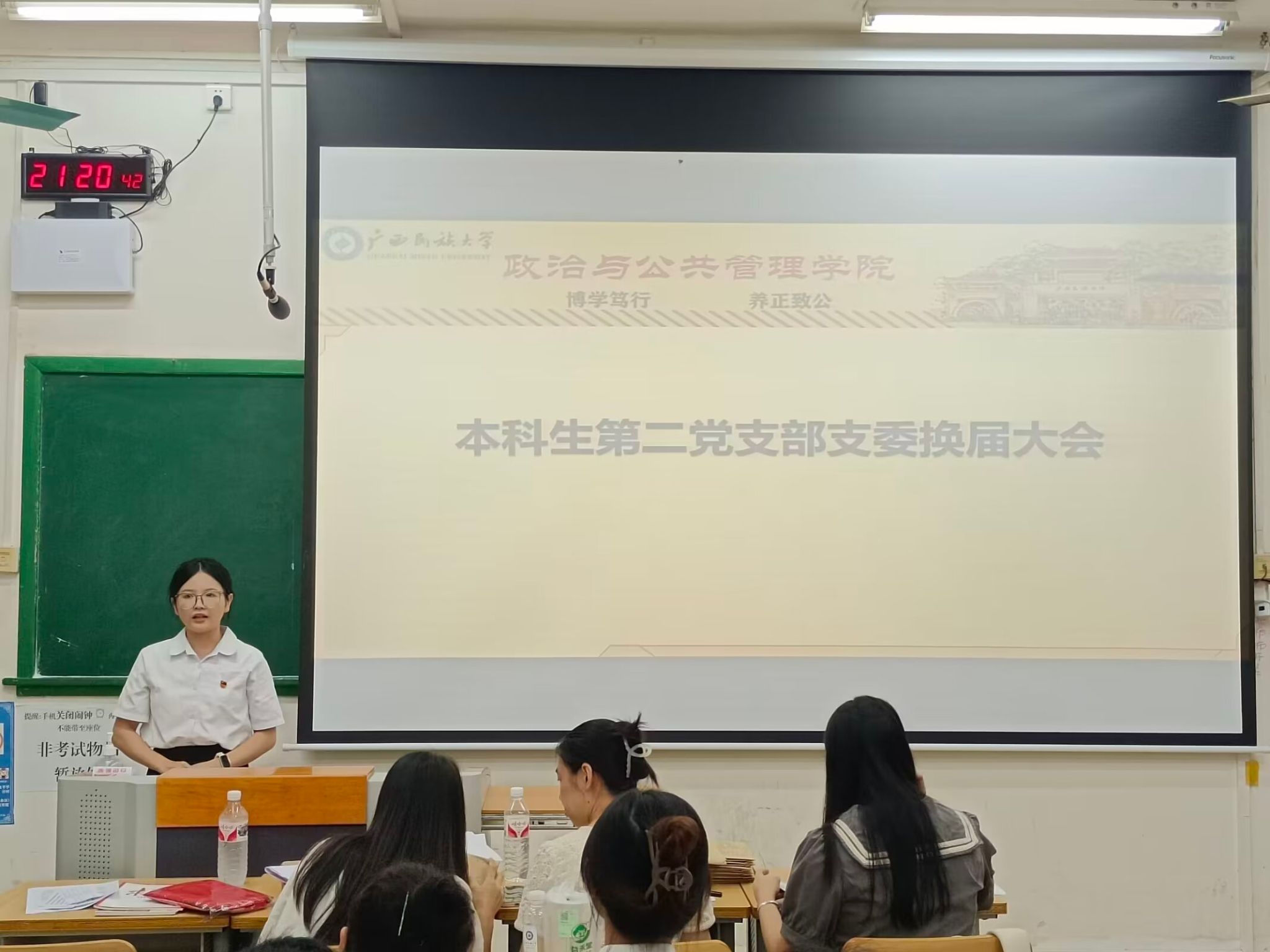 6月21日晚,广西民族大学政治与公共管理学院本科生第二党支部委员换届大会于博文楼103室举行。支部书记农植媚和全体党员参会,会议由组织委员黄秀华同志主持。
