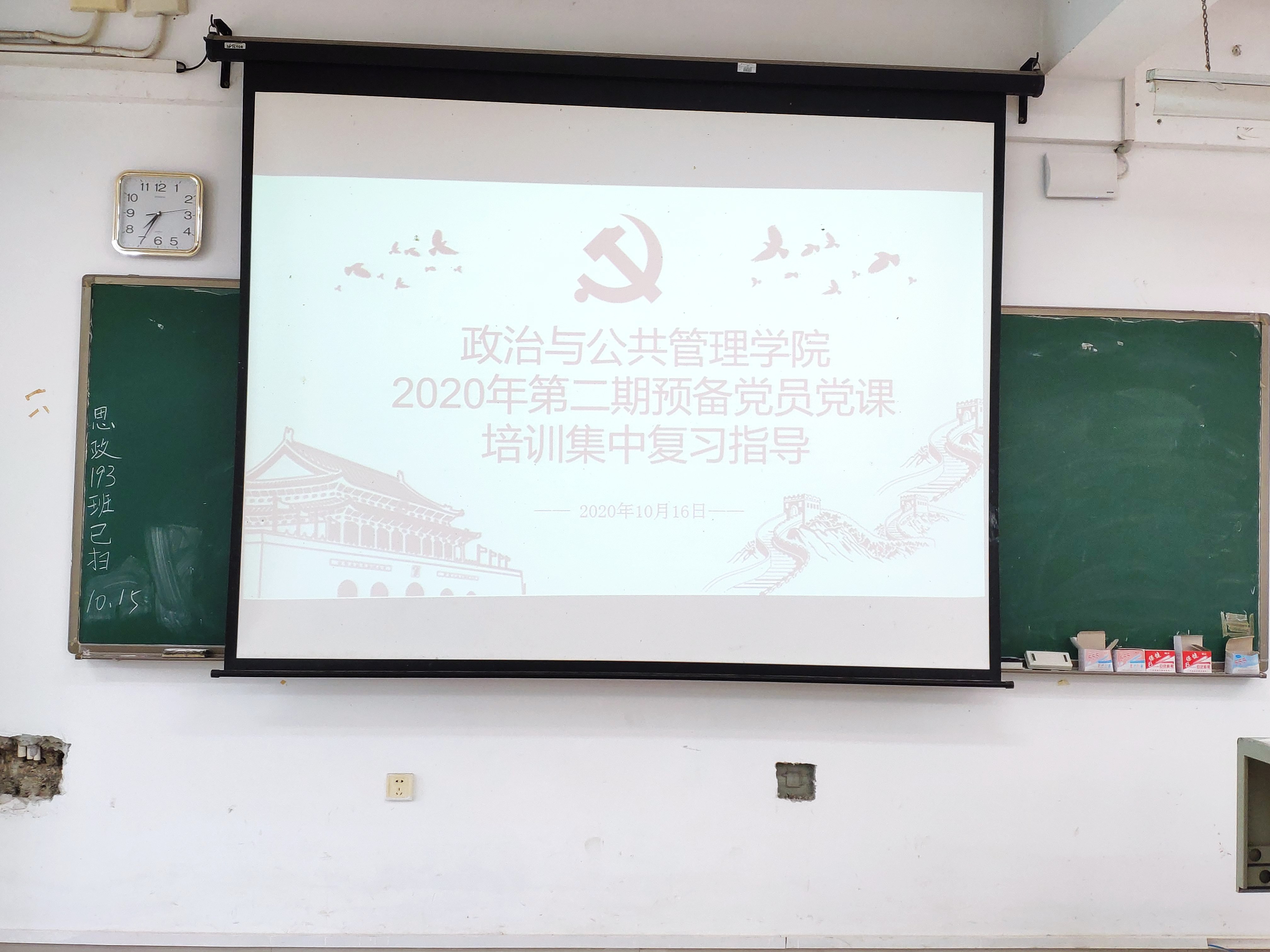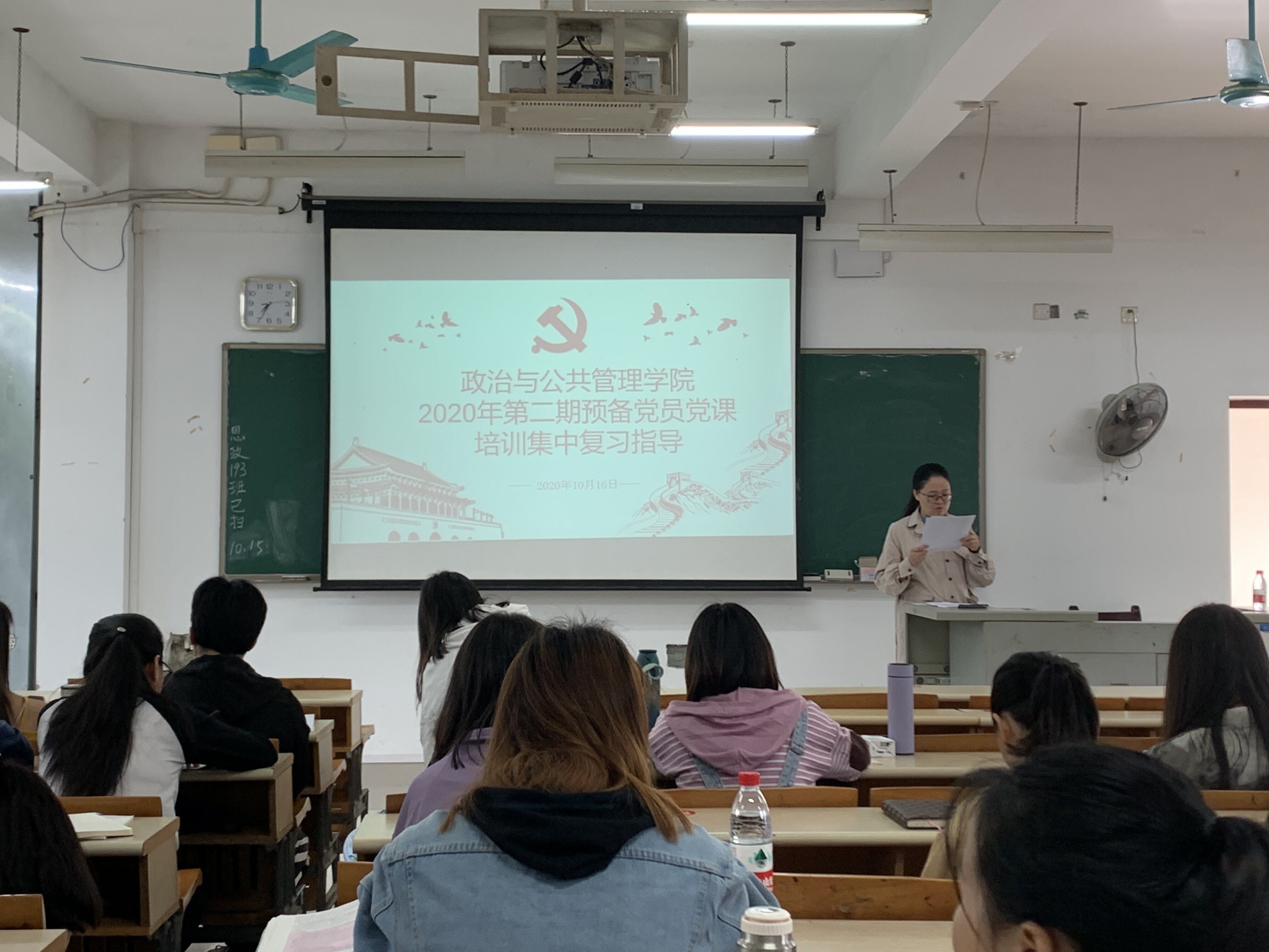 2020年10月16日上午9点,政治与公共管理学院2020年第二期预备党员党课结课培训于明德楼203举行,本次党课结课培训由政管学院第二学生党支部书记谭月老师主持,共有55名预备党员参加。