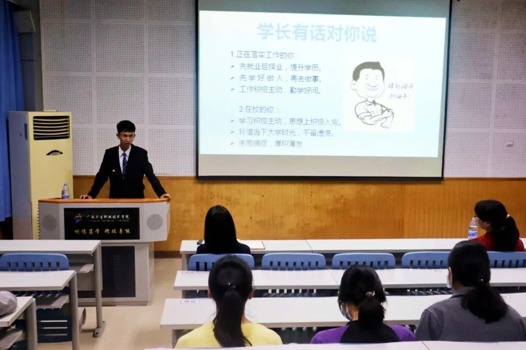 黄矶珠学长从他的大学生涯谈起,主要跟同学们交流了三个方面的内容:一是我为什么要选择回基层,二是基层的工作现状,三是回基层我们可以做什么。他说:“机遇总是留给有准备的人,在基层的日子里,我会不断完善自己,提高自己的专业水平。为基层群众做出更大的贡献。”