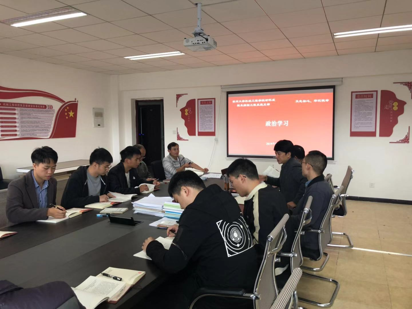 2019年10月24日,材料成型及控制工程党支部开展政治学习。本次学习内容主要为“习近平新时代中国特色社会主义思想学习纲要”,全体党员认真学习,并一一发言。