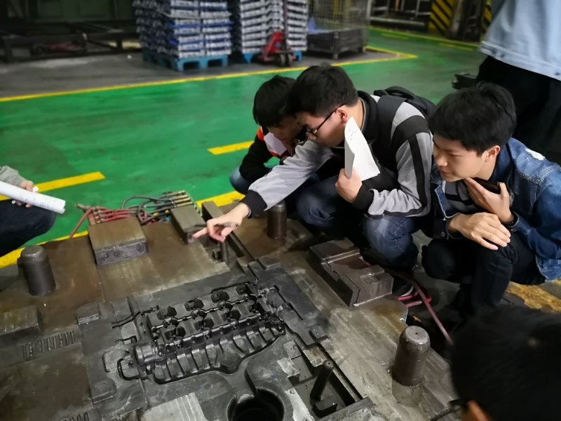 本次实习的单位是做金属零件成型及精加工的企业,主要生产汽车及汽车发动机、航空产品制造及外贸机械产品零部件。同学们在实习地见到了很多的压铸设备、压铸模具及压铸零件。带队教师及企业工程师对压铸工艺特点、压铸机结构、压铸零件应用范围等做了介绍;重点讲解了压铸模具各结构的作用,介绍了复杂模具的工作原理,对分型面选取、侧抽芯结构设计、浇注系统设计、缺陷控制、成本控制等模具设计过程的核心问题进行了剖析。