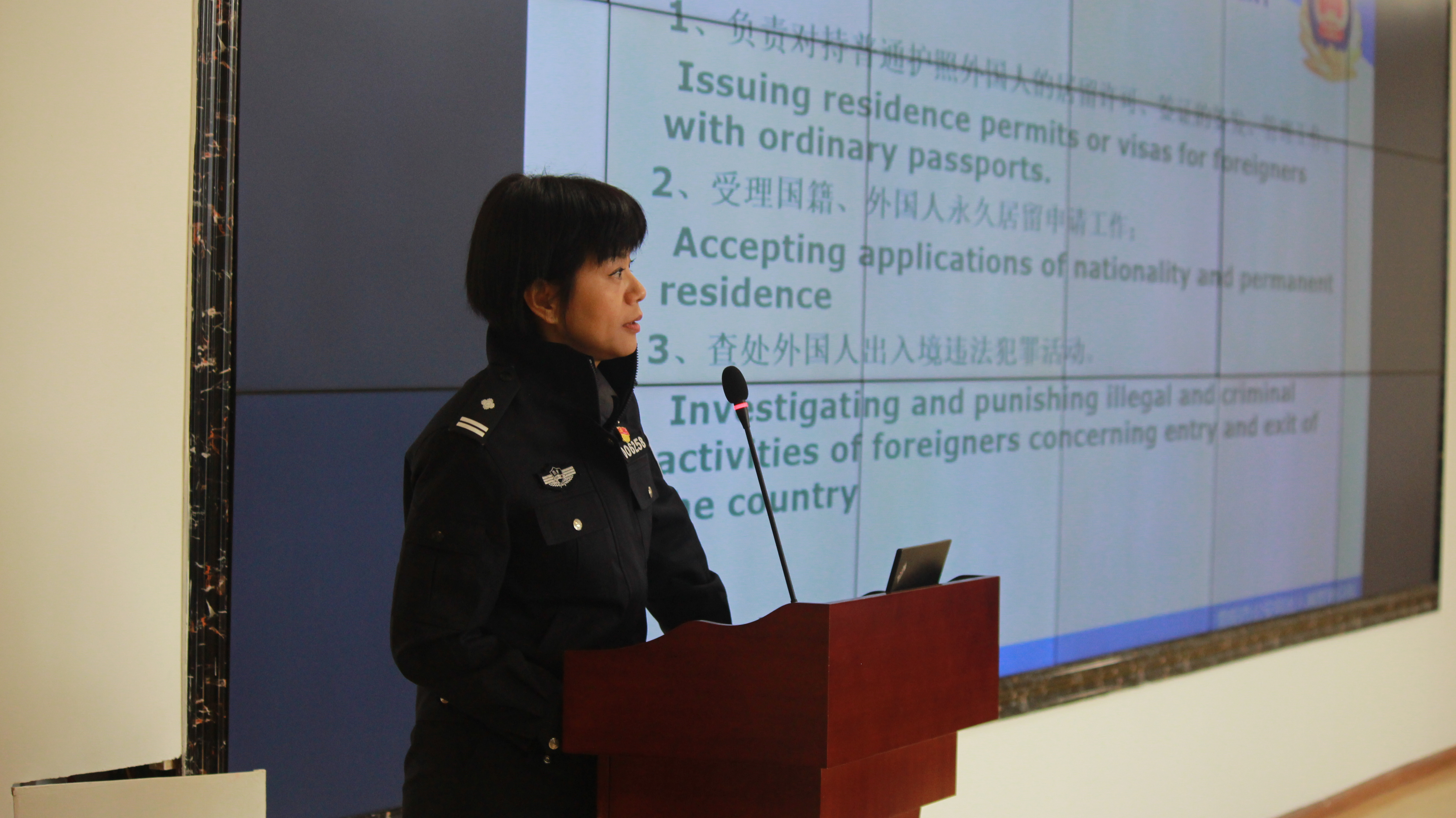 贵阳市公安局出入境管理分局冯凤珍警官为留学生进行入境出境管理法律法规培训,主要内容包括签证及居留许可的办理、逾期处理办法、住宿登记及留学生在华非法就业的法律规定等。刘警官对留学生提出的问题进行了详细解答。