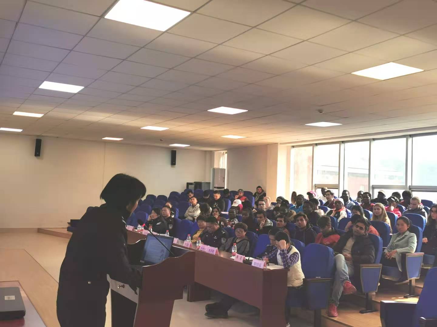 11月12日上午,国际教育学院留学生法律法规及安全讲座在西校区经济学院523多媒体教室举行。贵阳市公安局出入境管理分局、贵阳市公安局花溪分局、松山派出所一行6名警官出席,国际教育学院50余名留学生及全体教职工参加讲座。
