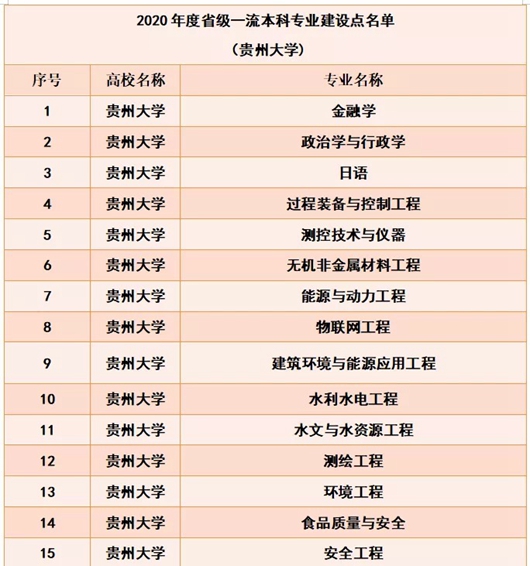日前,教育部公布了2020年度国家级及省级一流本科专业建设名单(教高厅函〔2021〕7号)。贵州大学12个专业入选国家级一流本科专业建设点名单,24个专业入选省级一流本科专业建设点名单。