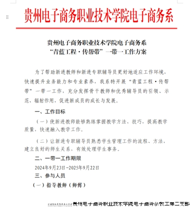 为了更好地落实立德树人根本任务,贵州电子商务职业技术学院电子商务系教工第二党支部积极响应教育部党组关于高校“双带头人”教师党支部书记培育工作的号召,深入贯彻其部署要求。力争在党建联建、教育服务、科技赋能、实践育人等“强国行”专项行动工作中,充分发挥高校“双带头人”教师党支部的示范引领和辐射带动作用,为推动高校党建工作和教育教学工作的开展作出新的更大贡献。