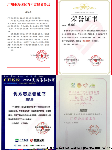 “星晖”志愿服务队在积极参与广州塔公共文明志愿服务的过程中,以良好的精神风貌和专业的服务态度赢得了海珠区志愿者协会的认可,广州海珠区志愿者服务向学生党支部志愿服务队发来感谢信,对他们在志愿服务活动中的突出表现表示衷心感谢。在服务红山街道的过程中,获得广州市红山街社工服务站赠送的“真诚服务 热心为民”锦旗。团队成员庞嘉茵更是获得广州市海珠区青年志愿者协会授予的“优秀志愿者”荣誉称号。