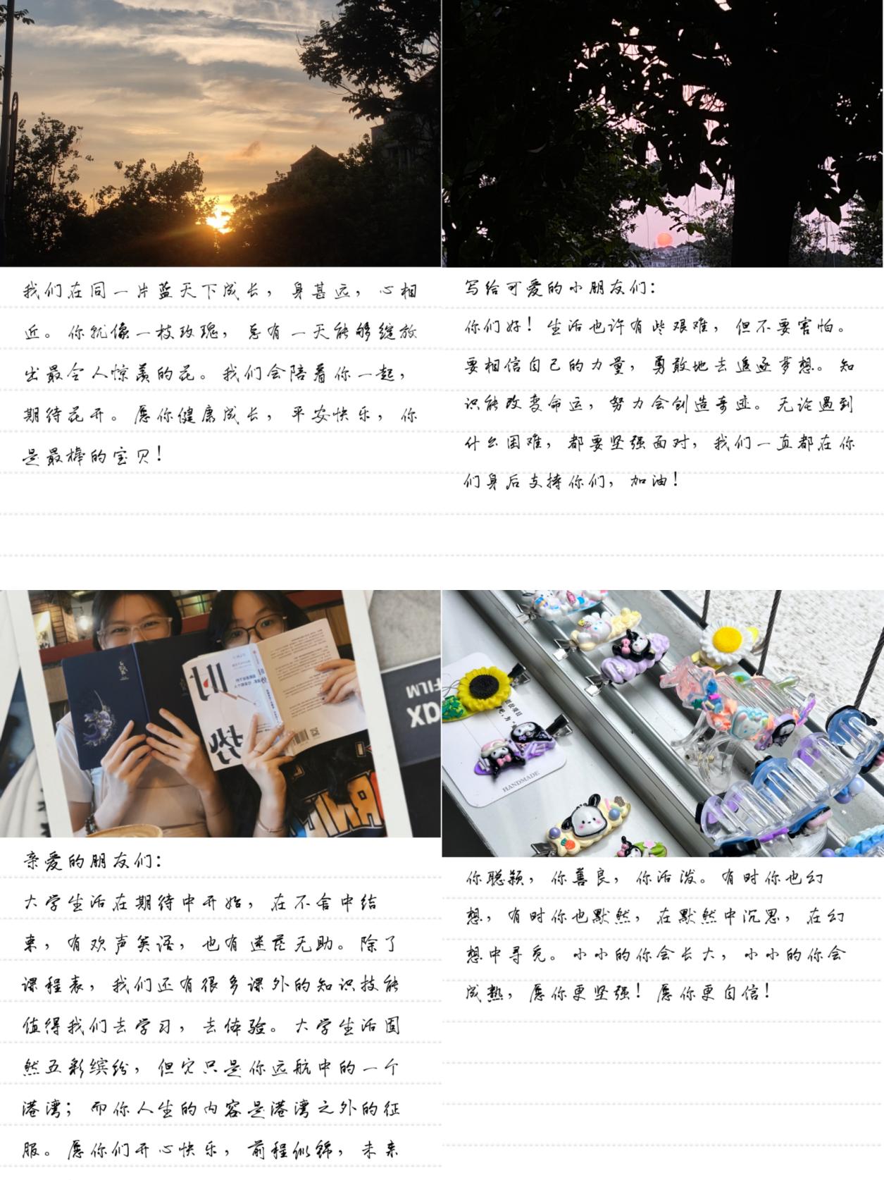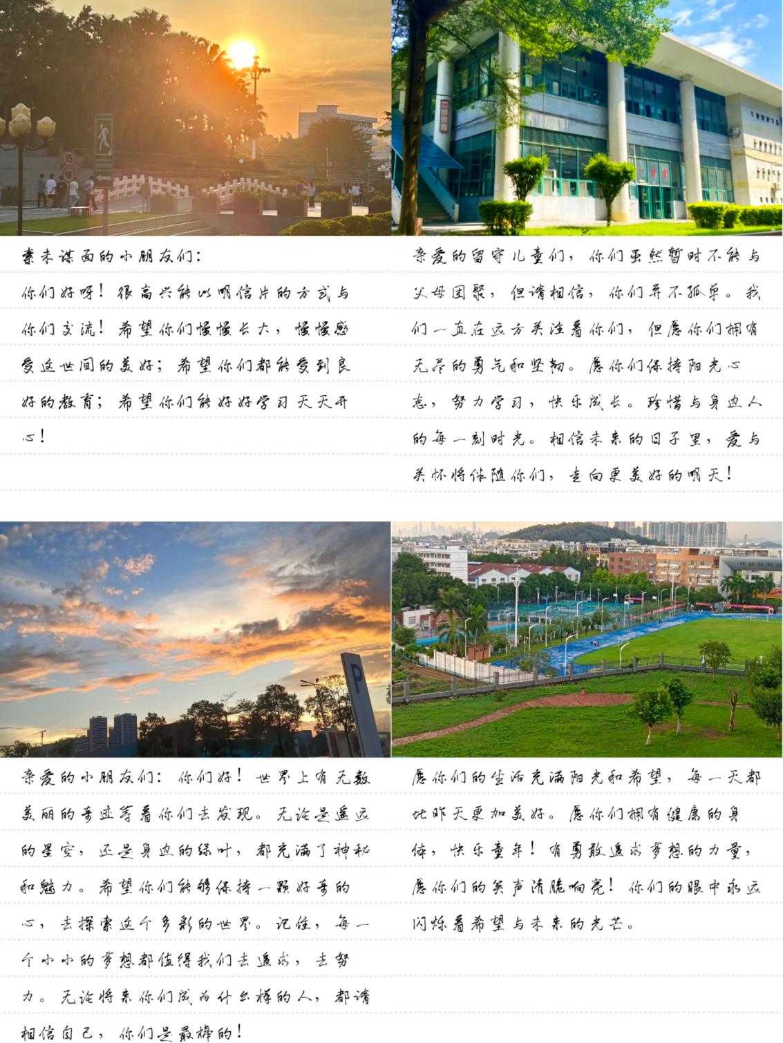 同学们在活动中发挥自己的创造力,制作出各类图片及手工作品,并使用简单有爱的文字鼓励留守学子积极向上,奋斗不息。青春的正能量在图片和文字中传递,描绘出互助互爱,携手并进的美好画面。