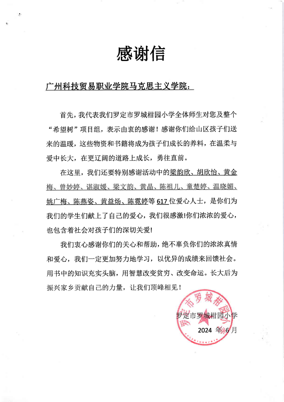 图6 受赠小学发出的感谢信