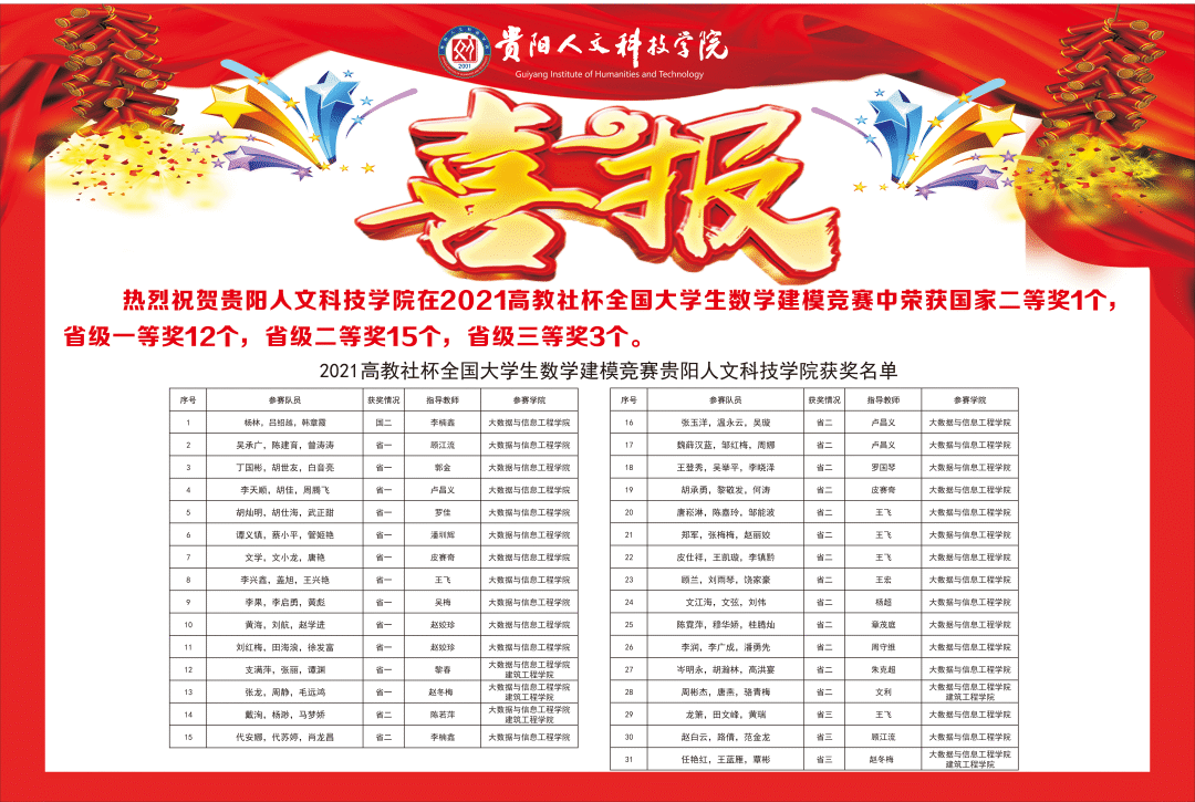 近日,2021高教社杯全国大学生数学建模竞赛结果揭晓,我校学生在此次竞赛中再创佳绩,分别荣获全国二等奖1项,贵州赛区一等奖12项、二等奖15项、三等奖3项。
