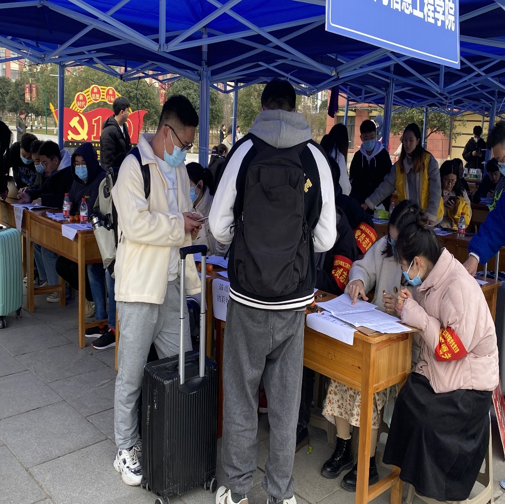 为确保新冠肺炎疫情常态化防控期间返校复学工作安全、有序地进行,同时为更好地发挥学生党员、入党积极分子的先锋模范作用,激励广大学生党员、入党积极分子坚定理想信念,增强责任意识、服务意识、表率意识,践行党的宗旨,保持党的先进性。大数据与信息工程学院学生第一、第二党支部于2022年2月27日联合开展了以“党员先锋勇担当,返校防控我先行”为主题的志愿服务活动。大数据与信息工程学院学生第一、第二党支部部分师生党员、入党积极分子参与活动。